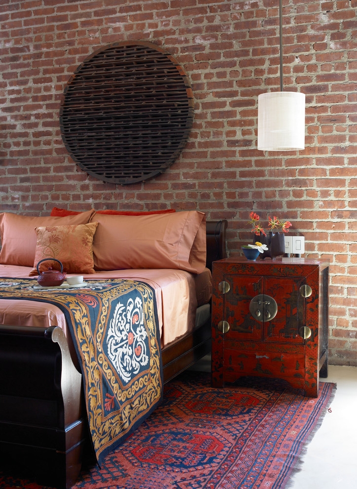 Debería haber muchas almohadas, sirven como decoración, una especie de lugar de descanso. En el estilo oriental, el uso de sillas en el dormitorio es inaceptable. Sus almohadas están completamente reemplazadas.