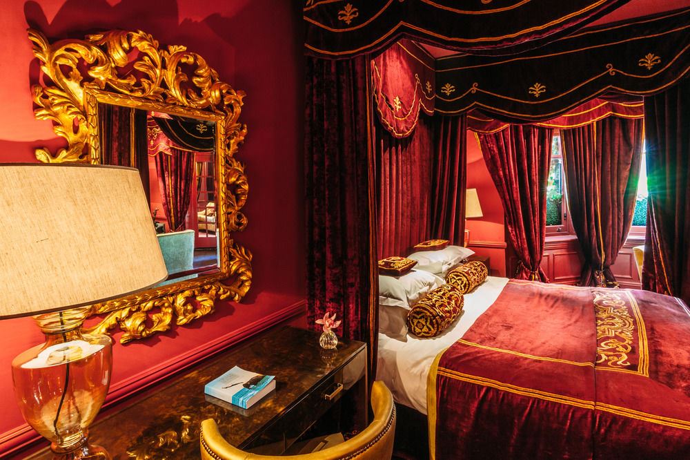 una combinación de un fondo rojo y numerosos elementos dorados;