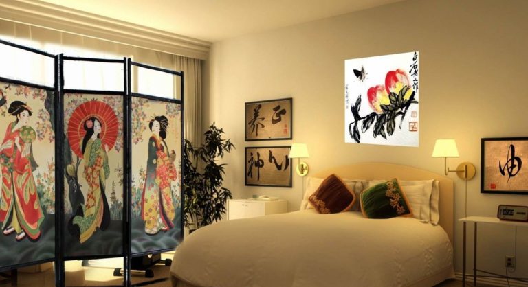 En la decoración de las paredes predominan los motivos florales. A menudo, al crear un interior japonés, se utilizan estructuras deslizantes (puertas de entrada, armarios).