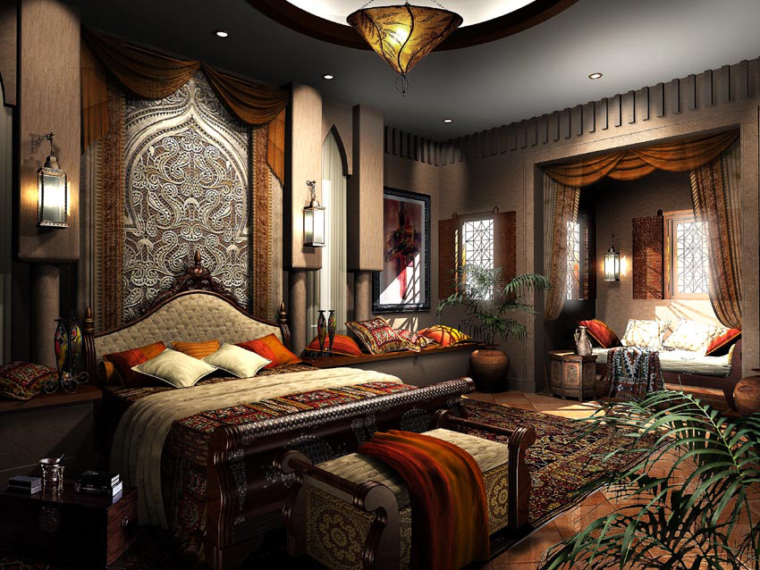 El Islam y las tradiciones antiguas han influido mucho en el estilo árabe. Su característica distintiva es la presencia de una gran cantidad de todo tipo de formas geométricas y ornamentos. No se pueden usar imágenes en vivo. Este matiz se debe a la influencia del Islam. Es por eso que la pintura o los elementos realizados en técnica escultórica nunca se utilizan en el estilo árabe.