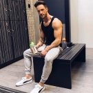 - Pantalones de entrenamiento popular entre los hombres de la misma manera que los pantalones cortos deportivos. Los pantalones a menudo se complementan con camisetas, polos y camisas de lucha sueltas. Dicho equipo es óptimo para correr y hacer ejercicio en simuladores.