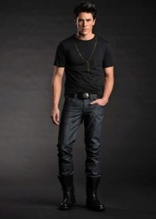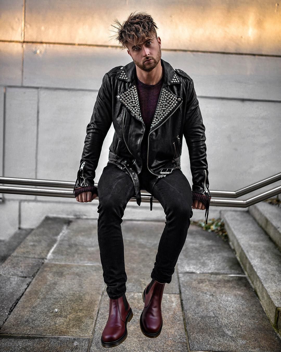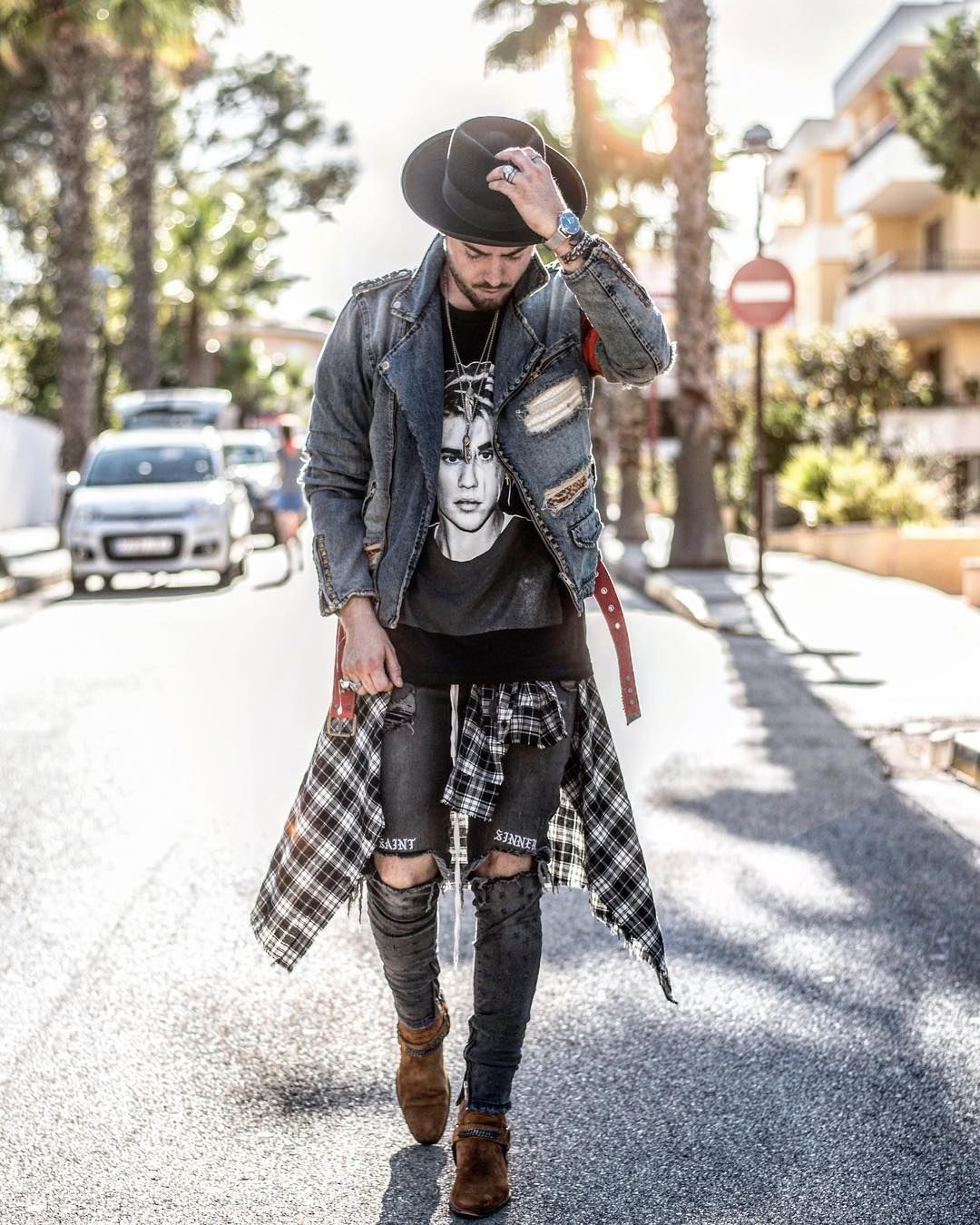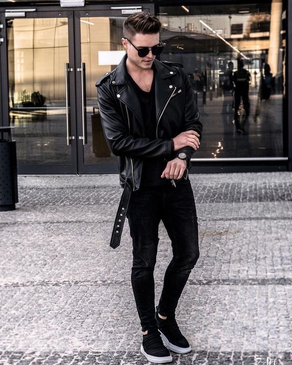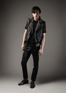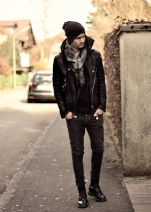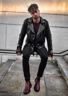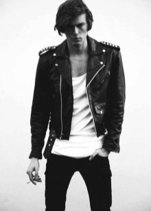 El estilo rockero es bastante masculino, brutal. Los conjuntos de estilo rockero están imbuidos de masculinidad de principio a fin. El cuero, los jeans se usan en grandes cantidades, el corte puede diferir. Camisetas y camisetas con estampados de bandas famosas, adornos temáticos son bienvenidos. Los picos, botones, remaches, cadenas se utilizan a menudo como adornos decorativos. La chaqueta motera es el representante más llamativo de esta imagen. Se pueden utilizar colores: negro, gris, gris, blanco, rojo, verde. Zapatos: desde zapatillas hasta cosacos, botas ásperas y botas de vaquero.