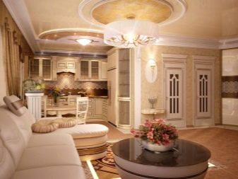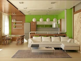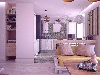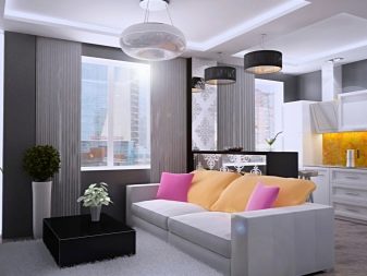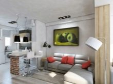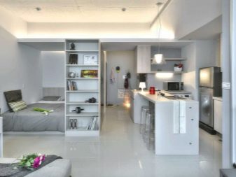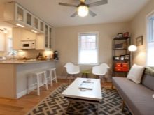 Aún más multifuncional será una estructura hecha de placas de yeso, de la cual la cama "se desliza". Es mejor no hacer un área de comedor separada en absoluto; sería mucho más correcto comprar una mesa y sillas plegables para la llegada de los invitados e instalar algo como una barra de bar, que también puede actuar como un escritorio o una superficie para Cocinando. El área de la cocina se distingue mejor por un juego en forma de L o U, así como una alfombra brillante. Asegúrese de usar el alféizar de la ventana con prudencia, transformándolo en un escritorio o encimera.