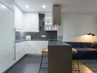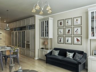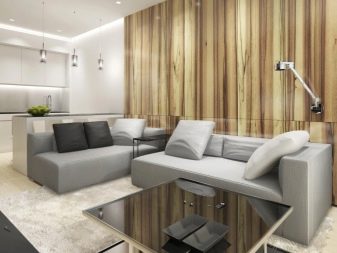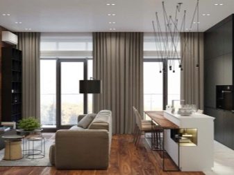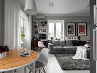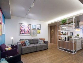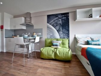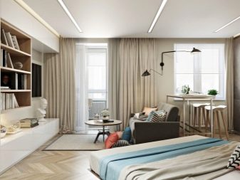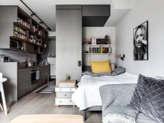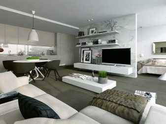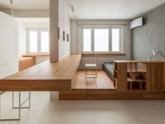 Vale la pena mencionar que Los estudios pueden ser previstos por el proyecto o formados como resultado de la remodelación. Los primeros en Rusia comenzaron a aparecer hace solo 5-10 años. A diferencia de un apartamento de una habitación, un estudio tiene un área más pequeña de unos 30 metros cuadrados y, de acuerdo con la ley, la superficie habitable mínima debe ser de hasta 19 metros cuadrados. Como se mencionó anteriormente, carece de recibidor y cocina separada, y el baño puede ser separado y combinado. A pesar de la presencia de varias zonas, se acostumbra utilizar un solo diseño en el espacio para que el interior se vea armonioso.