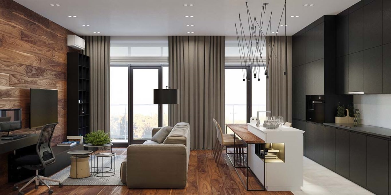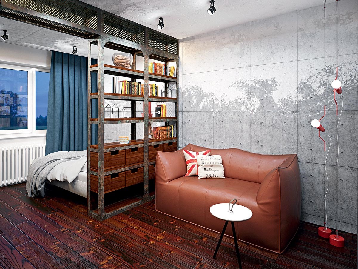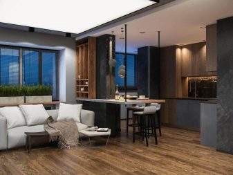 Un apartamento tipo estudio tipo loft requerirá el uso de tonos oscuros, superficies rugosas y comunicaciones abiertas. Incluso el hormigón desnudo y los ladrillos descubiertos son apropiados aquí. Por cierto, es en una habitación tipo loft donde las ventanas panorámicas se verán geniales. Lo mejor es colocar madera sin tratar en el suelo. Como decoración para el espacio, son adecuados los dispositivos retro, las lámparas envejecidas y las piezas de cobre y latón.