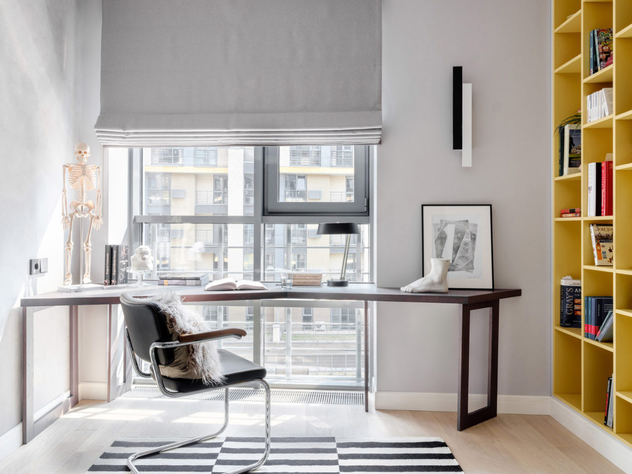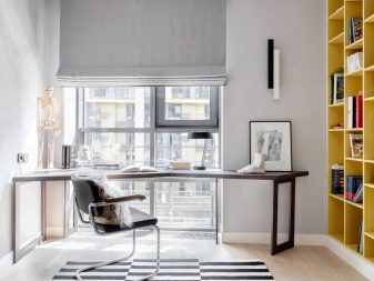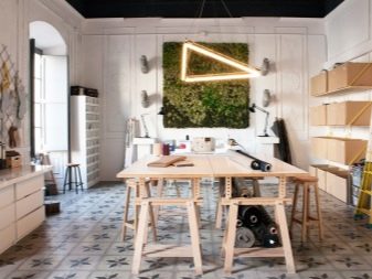 El estudio de estilo moderno no está sobrecargado de decoración y mobiliario. En él predominan los colores pastel como el empolvado o el beige, los materiales naturales y las formas sencillas. El piso está cubierto con parquet o laminado que se asemeja a la madera natural. Plantas vivas, pinturas, fotografías y textiles se utilizan como decoración en la habitación.