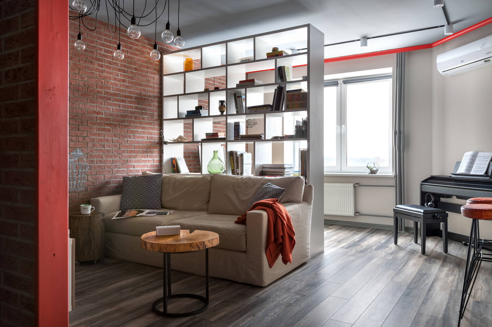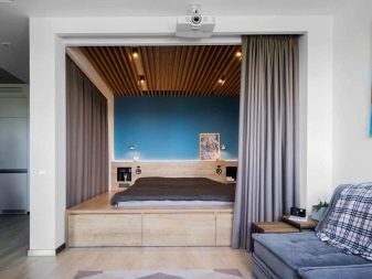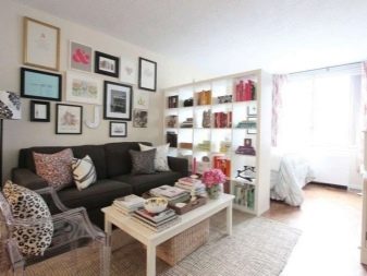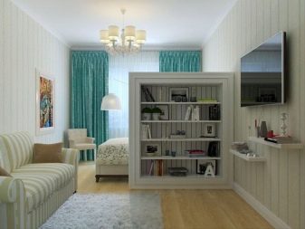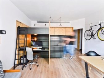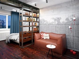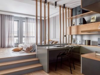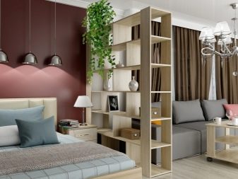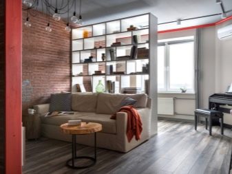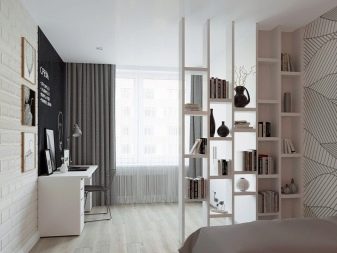 No puede prescindir de un bastidor en el estudio, que, por un lado, se convertirá en una partición y, por otro, servirá como espacio de almacenamiento adicional. El acuario también podrá realizar una doble función. En habitaciones espaciosas, también puede usar particiones falsas hechas de placas de yeso. Por cierto, si la altura de los techos lo permite, definitivamente debe construir el segundo piso, en el que se ubicará el lugar para dormir.