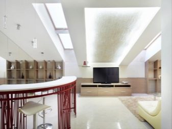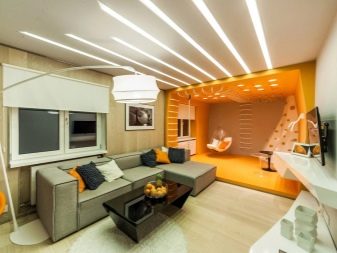 En un apartamento tipo estudio pequeño, se recomienda evitar las lámparas de mesa y de pie, que realmente no hacen frente a la tarea en cuestión, pero quitan un espacio importante. Lo más apropiado en un espacio de este tipo son las estructuras de techo de varios niveles, los apliques de pared compactos, las tiras de LED y la iluminación incorporada. Los candelabros deben elegirse de acuerdo con el mismo principio: dé preferencia a las formas compactas y lacónicas que no "abarroten" el espacio.