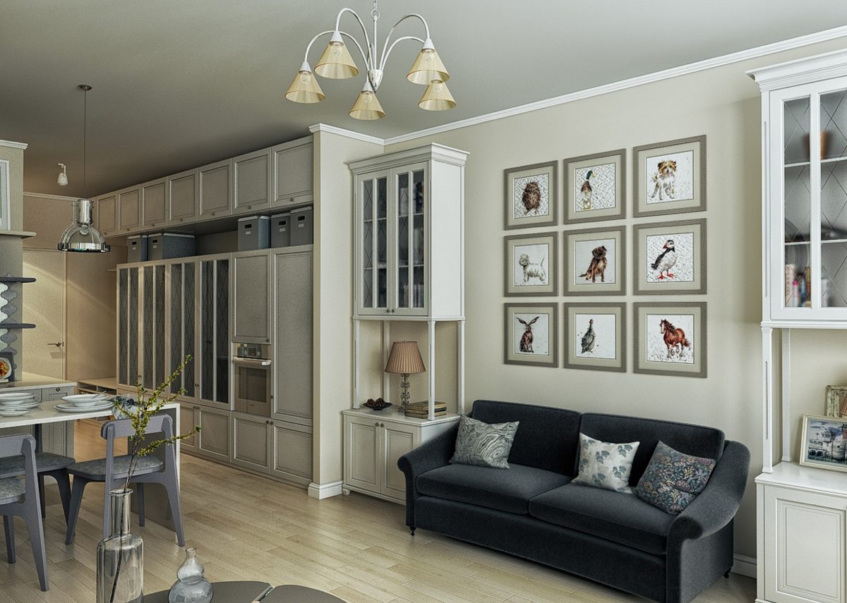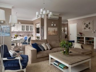- El diseño de un estudio bastante espacioso en un estilo clásico permite organizar no solo un área de cocina y un área de relajación con un sofá, sino también un dormitorio. En este caso, la zonificación parece muy interesante: la cama está oculta detrás de una partición deslizante. El beige y el gris, que son los colores principales, están en perfecta armonía con el acento azul. Para enfatizar zonas individuales, no solo se utilizan accesorios de iluminación y decoración, sino también acabados en diferentes tonos.