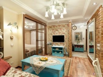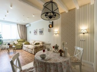 El estudio de estilo provenzal parece acogedor y original, pero no demasiado pretencioso. La paleta de colores principal debe ser tranquila, incluso pálida. Las texturas naturales, una gran cantidad de textiles y estampados florales son bienvenidos. Es mejor hacer que el piso sea de madera clara y decorar las paredes con papel tapiz. Los muebles tallados acomodarán orgánicamente platos de porcelana y servilletas de encaje.