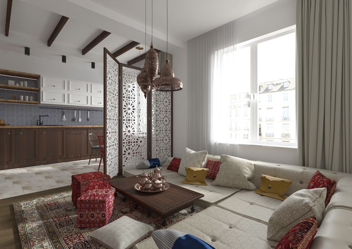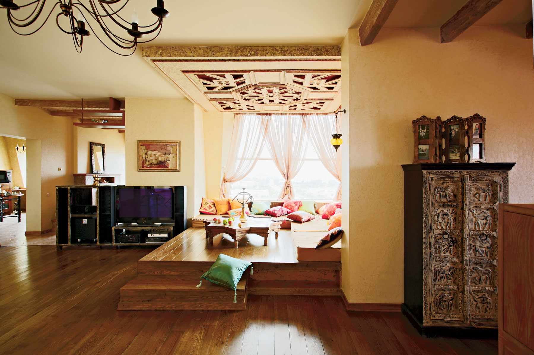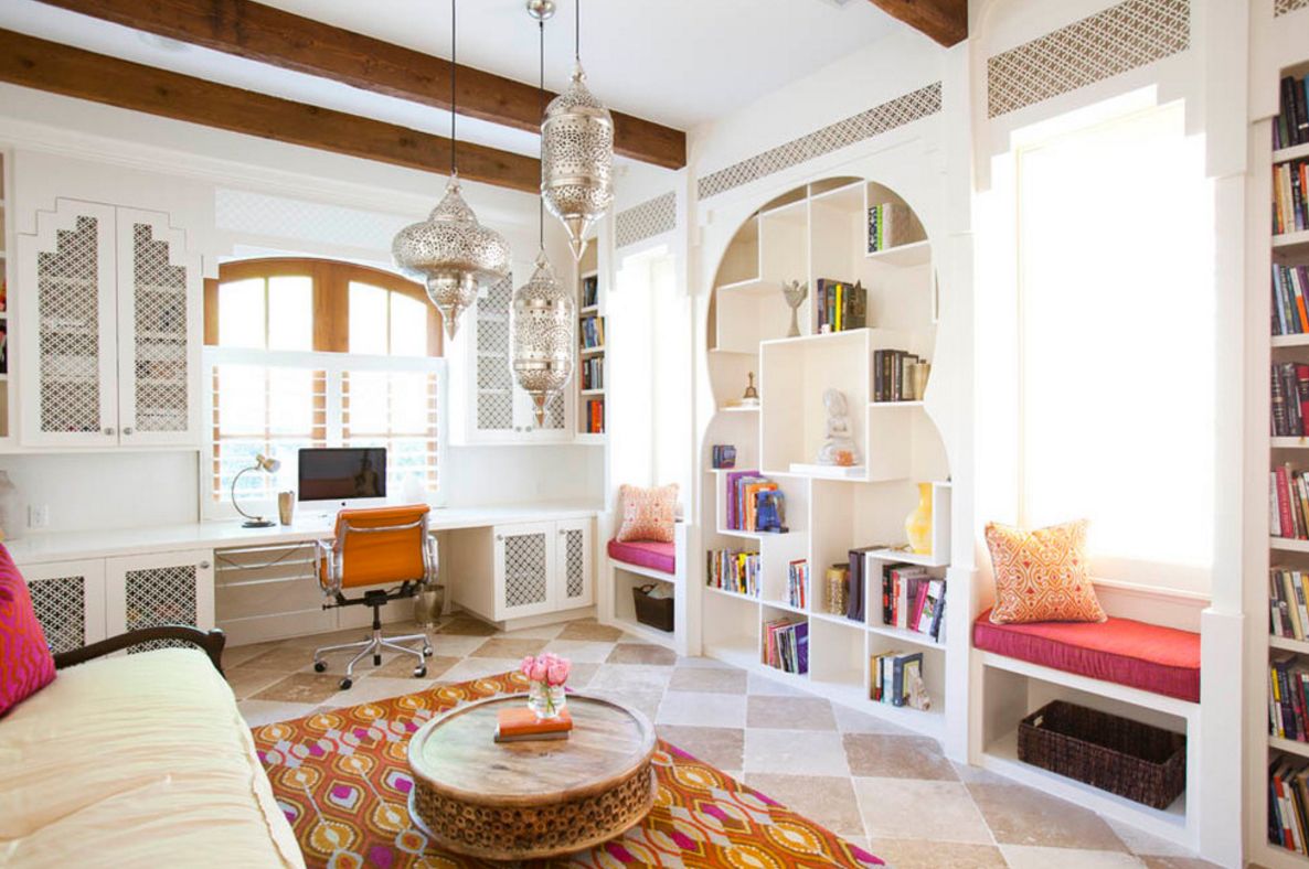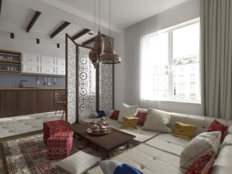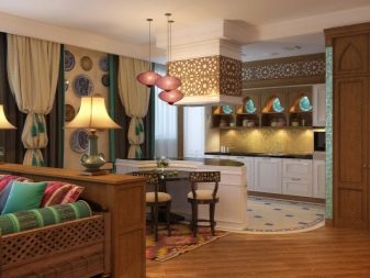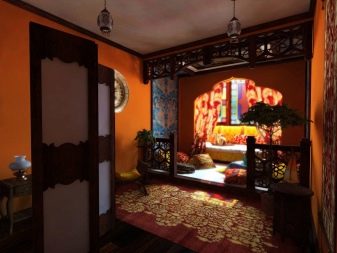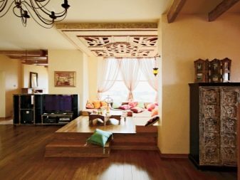 Al decorar un estudio en estilo oriental, no se puede escatimar en telas caras: terciopelo, brocado, seda y organza en colores brillantes. Una gran cantidad de decoración y textiles orientales debe estar presente en la habitación. Definitivamente, debe organizar un sofá con un sofá y una gran cantidad de almohadas o tapetes y pufs de mimbre.