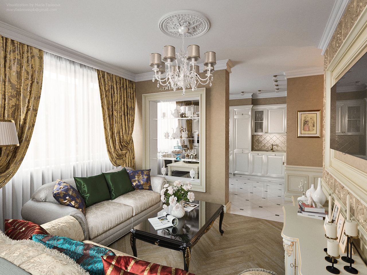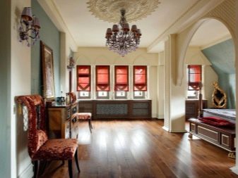 Los accesorios juegan un papel importante: estampados, cuadros, espejos en marcos ricos y cortinas multicapa con cortinas.