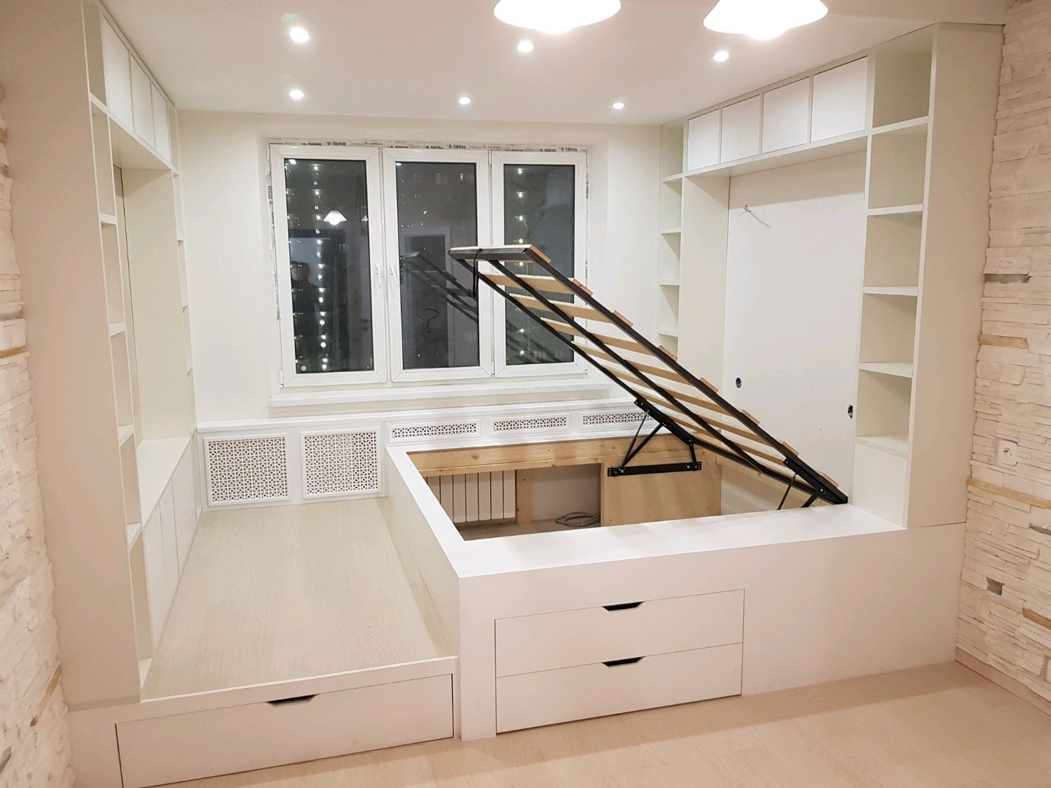 Tiene sentido mencionar que la cama suele ocupar un área grande, pero al colocarla en el podio, será posible colocar una zona de asientos y una zona de almacenamiento en el mismo lugar.