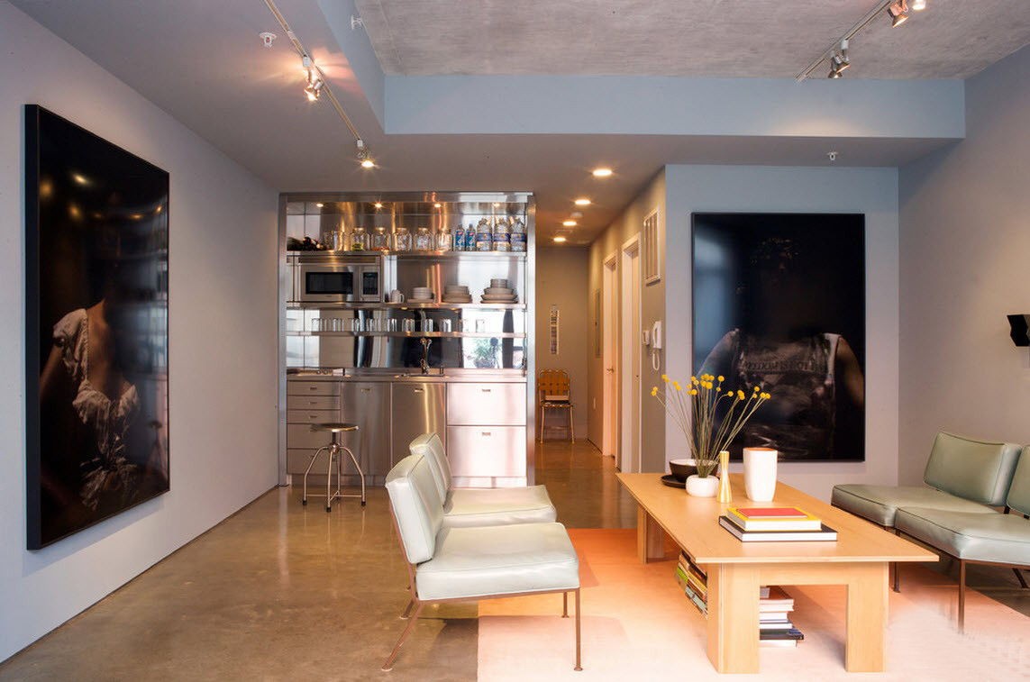 Por cierto, El minimalismo clásico implica el uso de no más de 5 tonos: algunos básicos y algunos acentos. El apartamento no debe tener bagatelas innecesarias: figuras decorativas, estantes desordenados, otomanas suaves y otros artículos no tan necesarios. Para el almacenamiento, es mejor comprar un armario espacioso, que también puede actuar como partición. La zonificación principal en dicho espacio se lleva a cabo mediante iluminación.