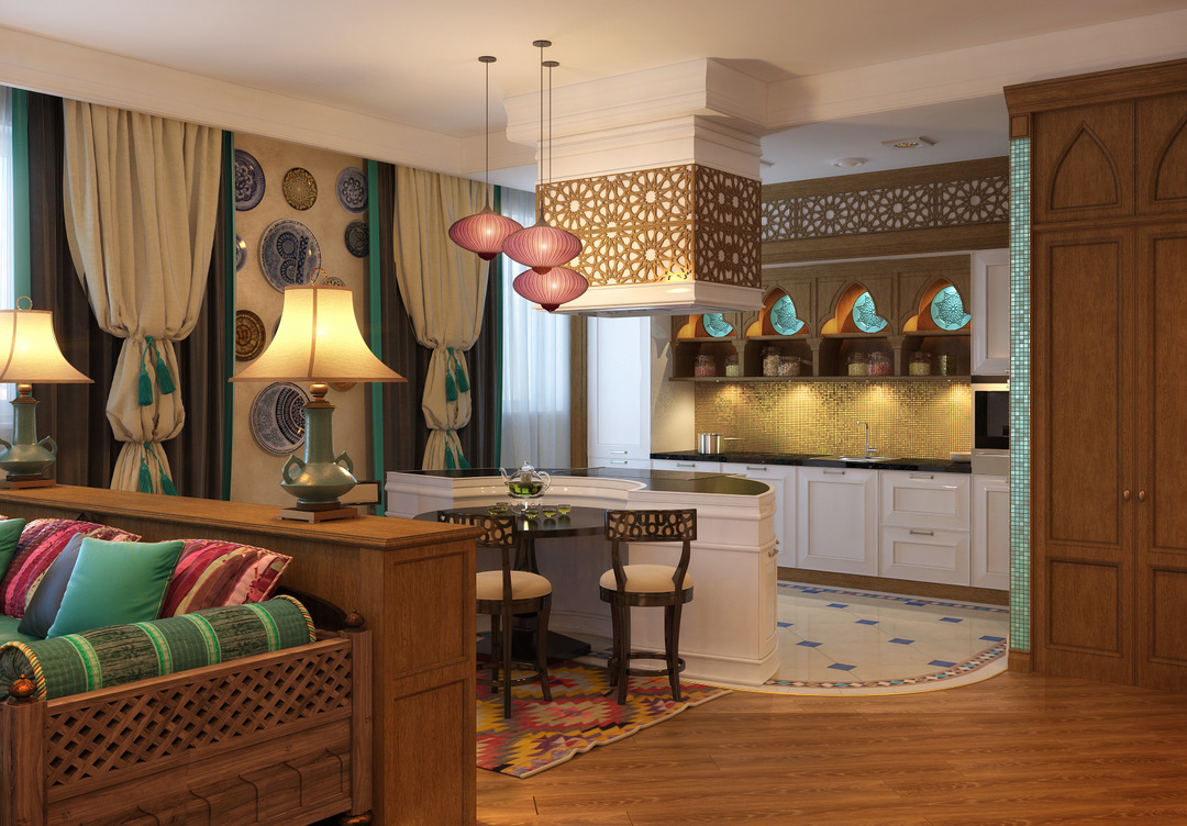 El diseño de la isla se ve bien en habitaciones divididas en zonas. Se trata de asignar un área de dormitorio con una cama, un área de recepción con un sofá y una mesa de café y un área de comedor con barra de bar.