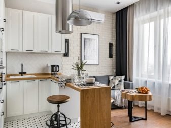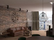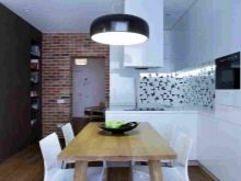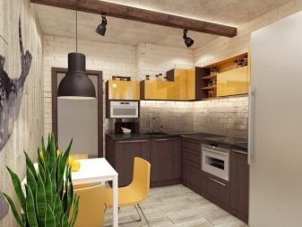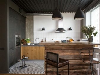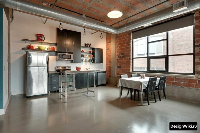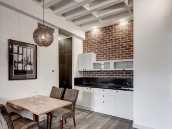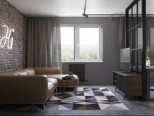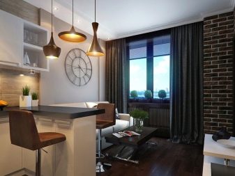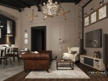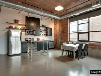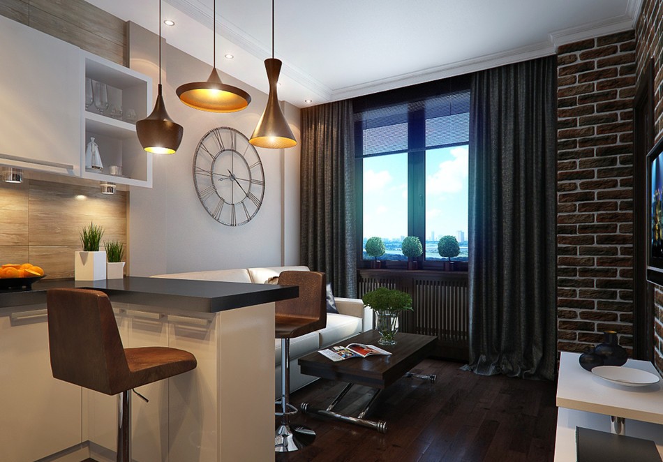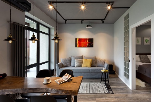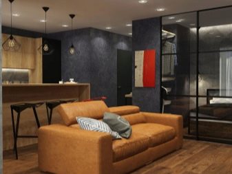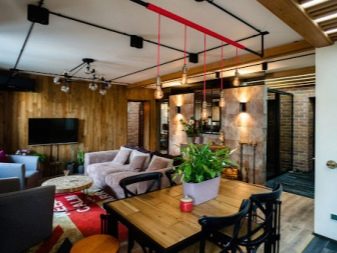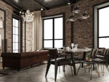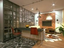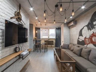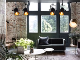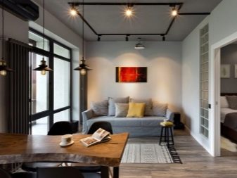- Encendiendo... Esta opción es más adecuada para espacios de 40, 45 m2. my más. Los ventanales grandes, panorámicos, son más típicos de un loft, es decir, debe haber suficiente luz en la habitación a priori. Pero la iluminación artificial también establece el ambiente del estilo: el área de la cocina se puede separar con muchas lámparas de estilo industrial, y en la sala de estar puede colgar una gran lámpara de araña o un complejo sistema de iluminación reunido en un solo lugar.