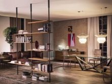 - consolas y racks - elementos de estilo frecuentes que reemplazan cajoneras masivas, hacen un excelente trabajo con la zonificación del espacio y sirven como espacios de almacenamiento espaciosos.