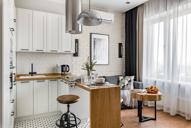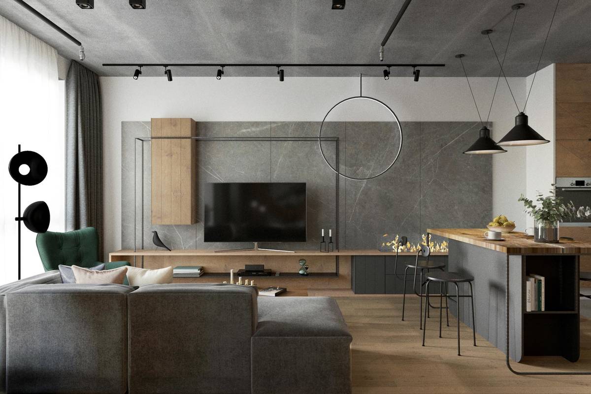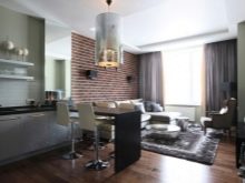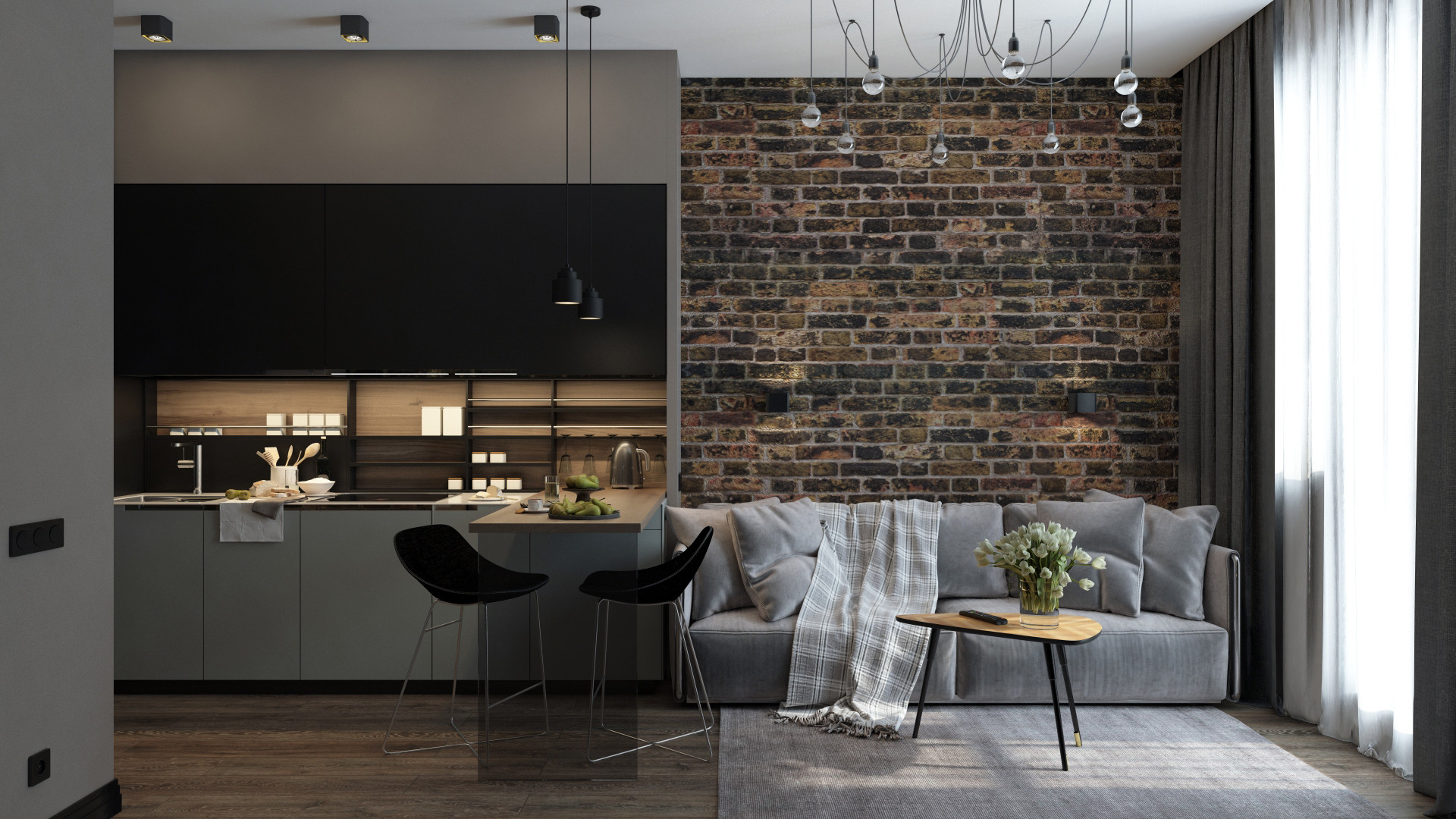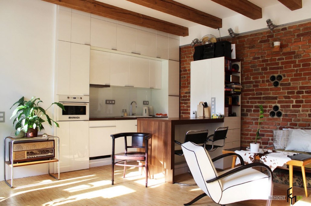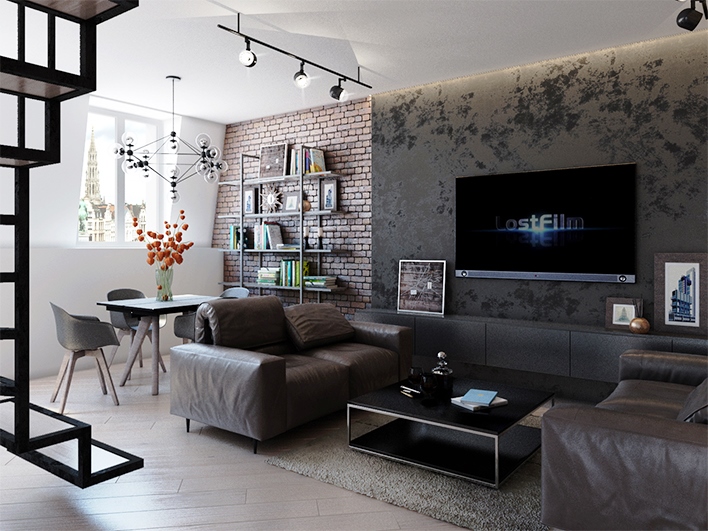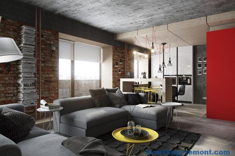 Zonificación de color... Una buena bienvenida que se adapta a espacios de 20, 22, 25 m2. m. Blanco, gris, marrón, negro: estos son los colores principales del loft. Los tonos fríos complementan los puntos brillantes en forma de decoración, pinturas, accesorios. Para separar el área gris de la cocina de la sala de estar marrón, puede hacerlo o puede superar diferentes tonos de gris en un proyecto, por ejemplo.
