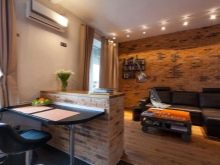 Una bicicleta colgada en la pared es mejor que cualquier decoración, y la decoración crea un ambiente de loft de tal manera que es posible que no note los elementos del interior de estilos tradicionales bastante ordinarios que han migrado inmediatamente aquí.
