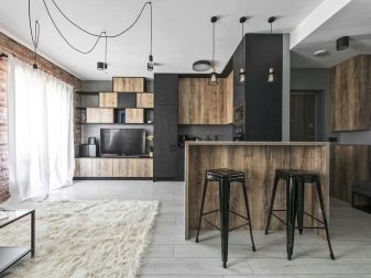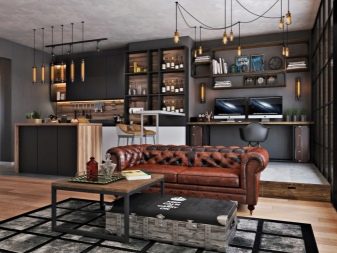 - Elementos requeridos... Uno de ellos es la barra del bar. No es que el diseño de loft no esté completo sin él, pero en 9 de cada 10 casos está en el estudio. Por cierto, también puede ser un soporte separador.