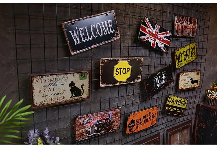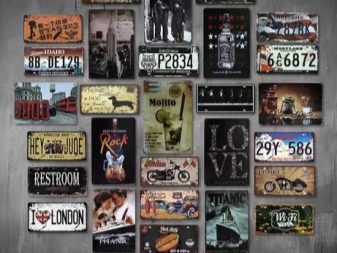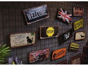 - Placas de información... Este es un estilo en el que las señales de tráfico, las señales de los restaurantes y los carteles retro se ven orgánicos. Demuestran que un hombre de la ciudad vive en este estudio, interesado, curioso y listo para experimentar.