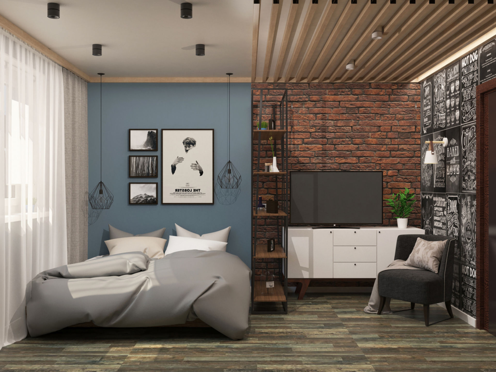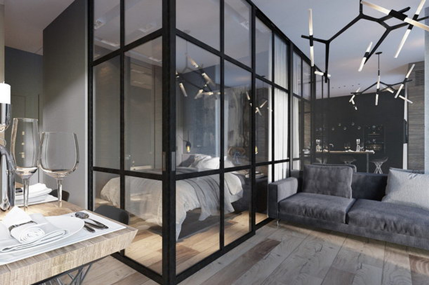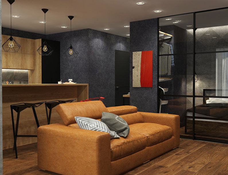 - El tipo de loft que se llama acogedor. Colores perfectamente combinados, accesorios de iluminación geniales y una cama detrás de un vidrio: aquí todo es perfecto.