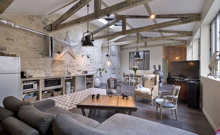 El loft no implica tabiques interiores, predica un solo espacio en el que se combina la cocina con el salón y el dormitorio. Esta podría ser una habitación grande con chimenea, por ejemplo. O no necesariamente grande: en pequeños apartamentos de una habitación, también se hace un loft, solo, quizás, sus variaciones más suaves, no sin un toque de minimalismo.