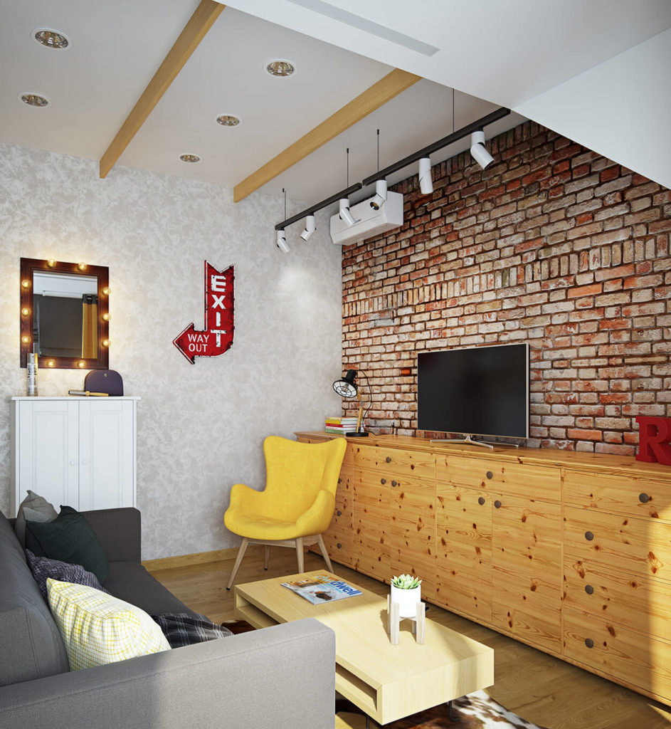 - Ladrillo, vigas, blanco con marrón y gris, y una mancha amarilla brillante (sillón) son bastante típicos de un loft. Pero estas fórmulas típicas funcionan muy bien.