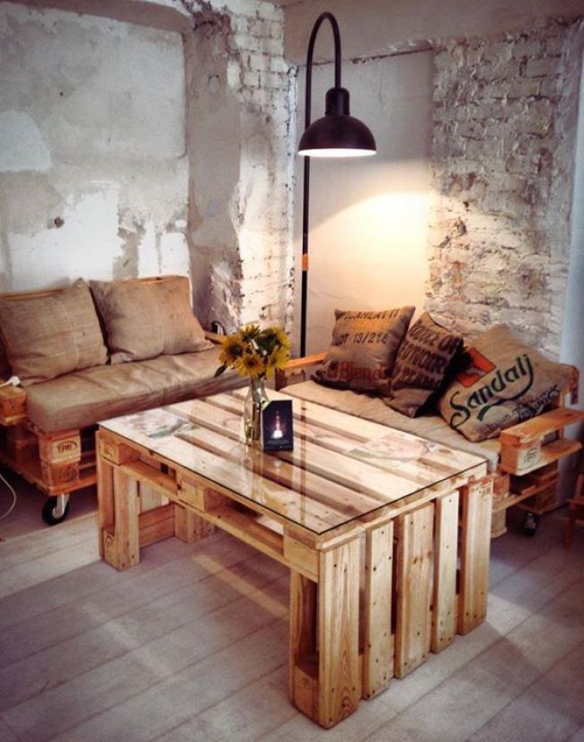 - Un sofá de paleta para un loft no es nada nuevo. Como una pared de ladrillos. Pero este es solo un ejemplo de que un estilo interesante no se correlaciona necesariamente con costos serios.