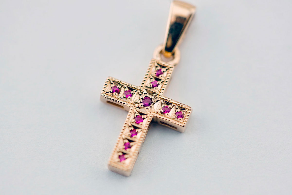 Las cruces modernas están abundantemente decoradas con inserciones. Las variantes con piedras son populares entre los hombres no menos que entre las mujeres. Por ejemplo, puede pedir un producto con un rubí o cualquier otra gema natural. Esto no es solo un símbolo de fe, sino también una decoración increíble. Los joyeros experimentan constantemente con formas y líneas. Se ha vuelto popular combinar diferentes materiales.