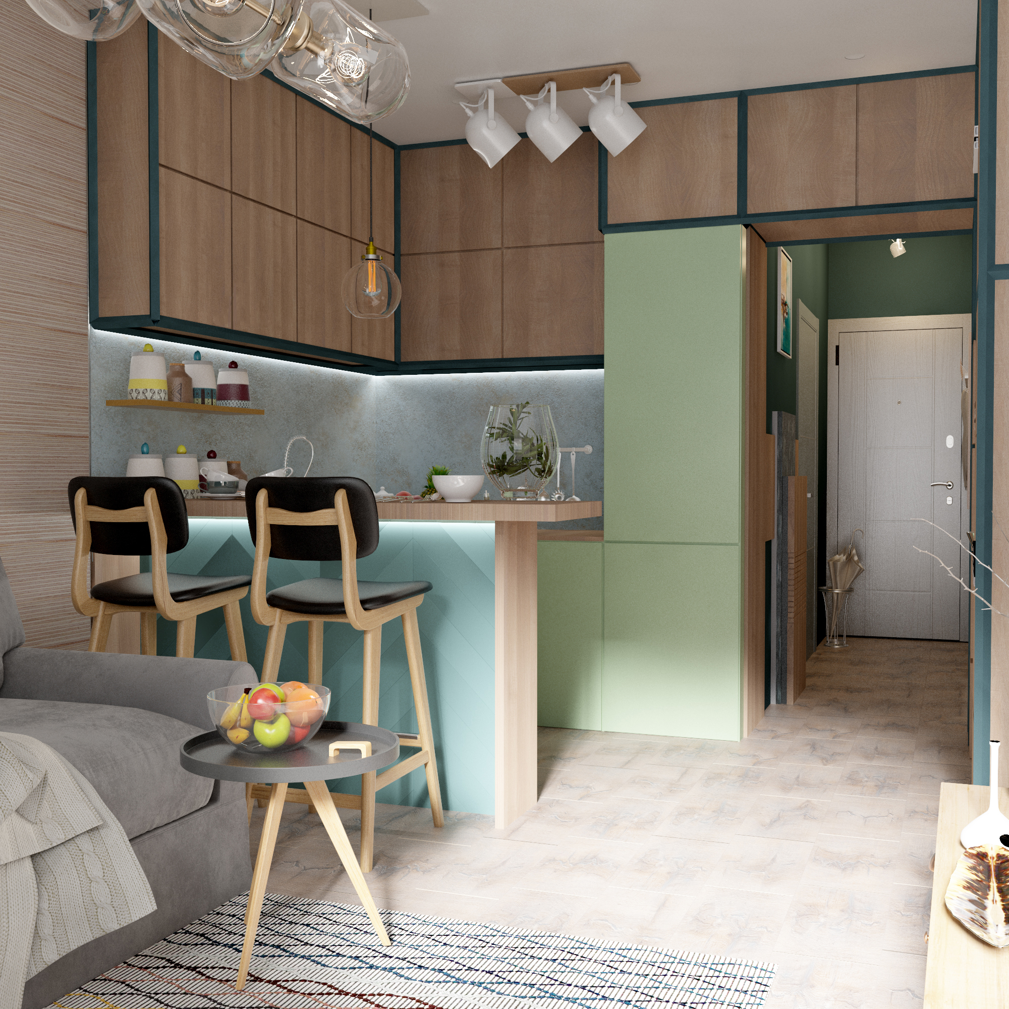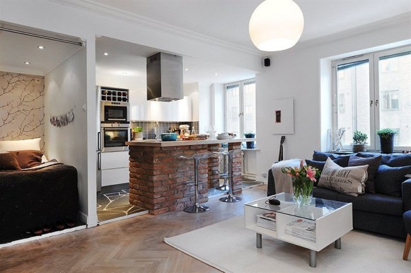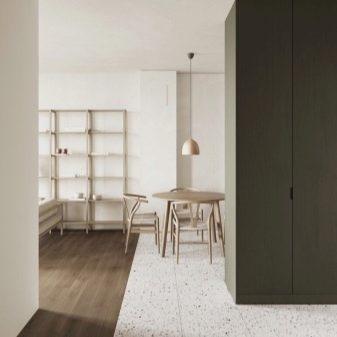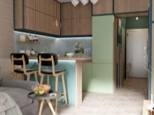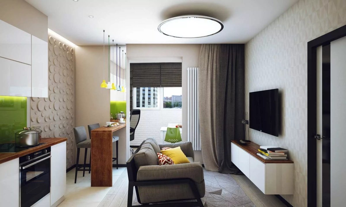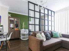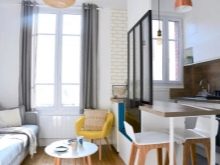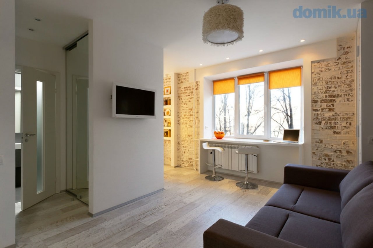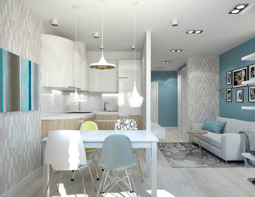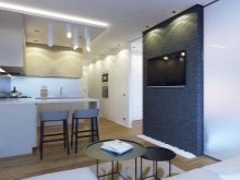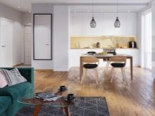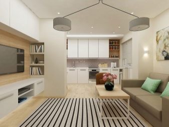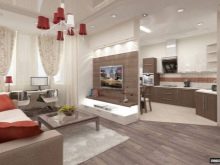 L'option, qui combine non seulement la cuisine avec le salon, mais également le hall d'entrée, réduit considérablement le coût du logement. La pièce principale occupe la majeure partie de l'appartement, le reste du territoire est occupé par une chambre et une salle de bain.