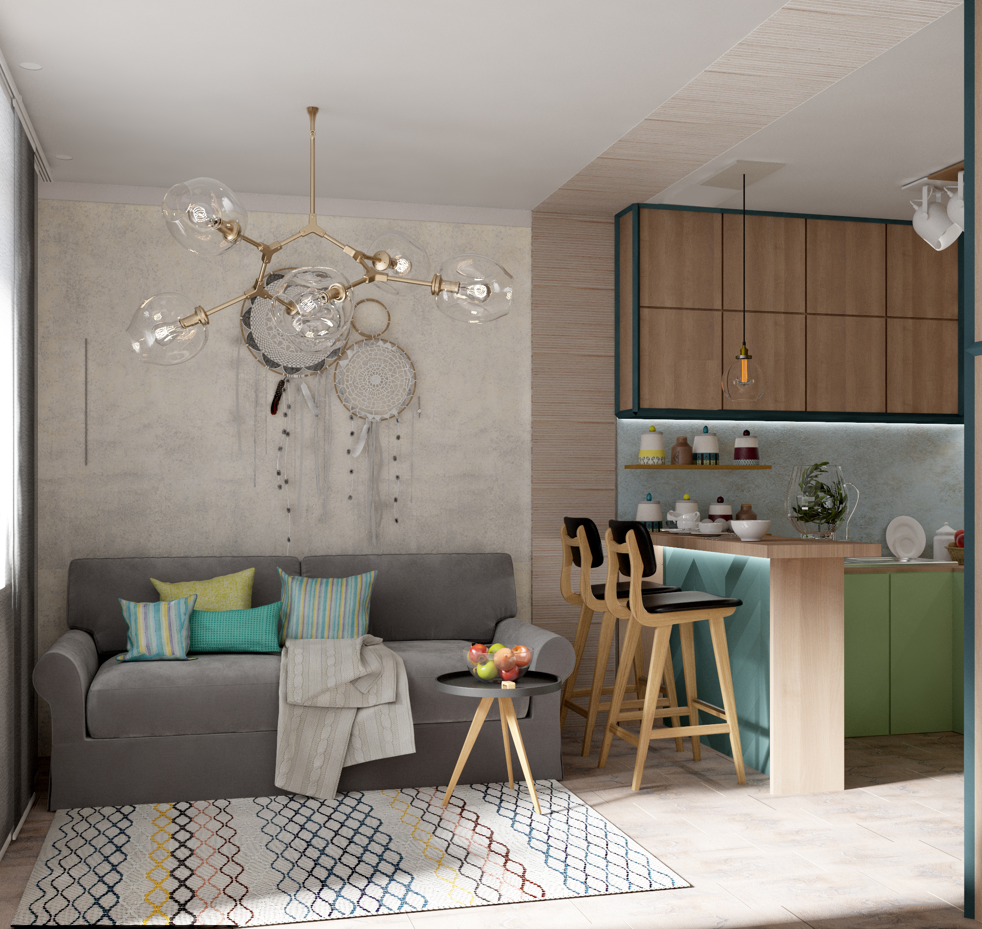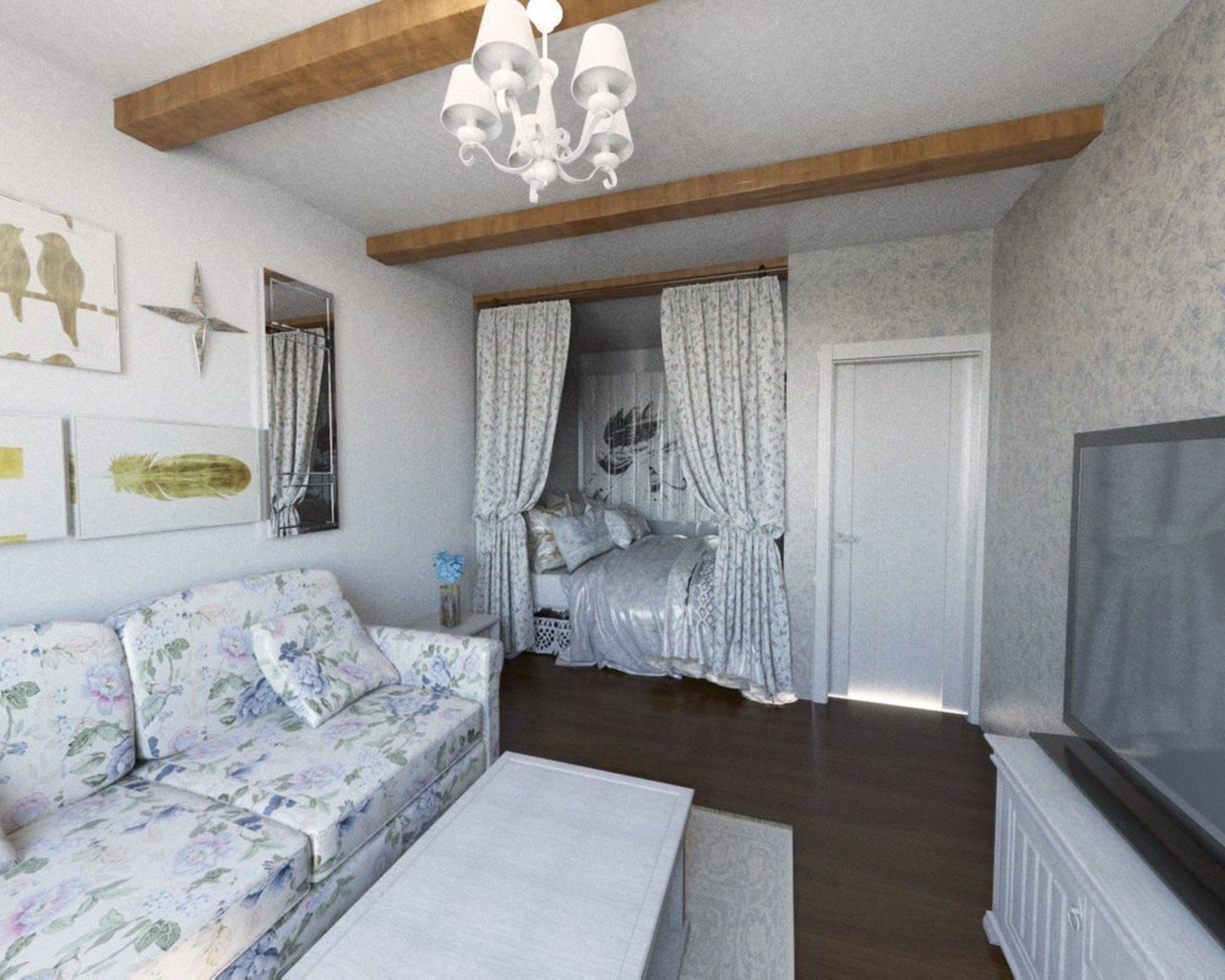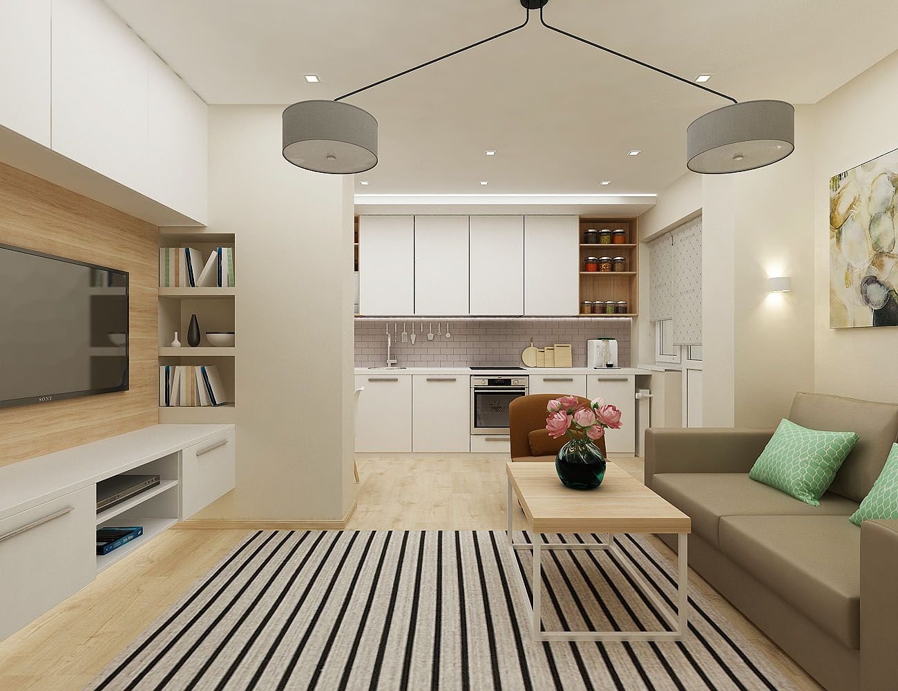 L'option, qui combine non seulement la cuisine avec le salon, mais également le hall d'entrée, réduit considérablement le coût du logement. La pièce principale occupe la majeure partie de l'appartement, le reste du territoire est occupé par une chambre et une salle de bain.