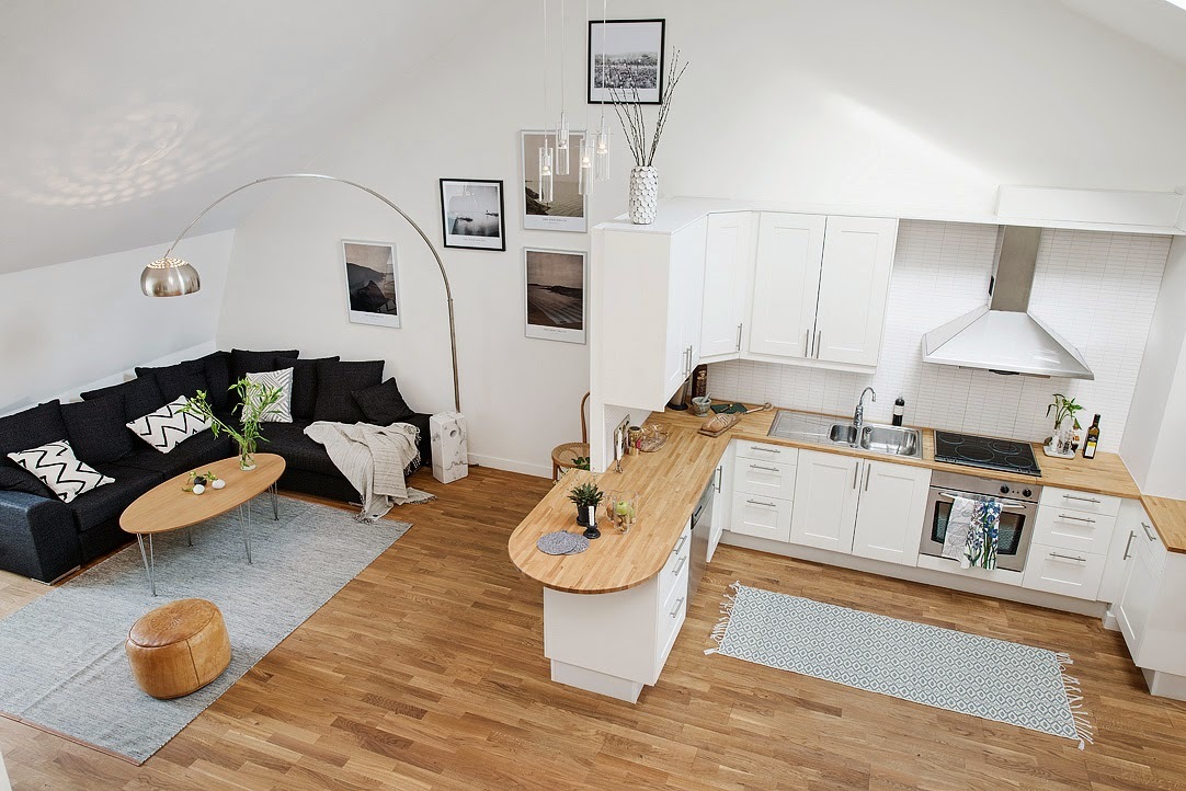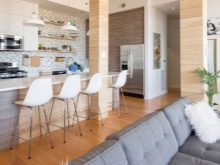 - Décoration mur, sol, plafond... Pour une zone spécifique de la cuisine, des matériaux imperméables sont utilisés - pierre, carrelage, plaques en PVC. Dans le salon, la moquette peut être utilisée comme revêtement de sol et les murs peuvent être peints ou recouverts de papier peint.