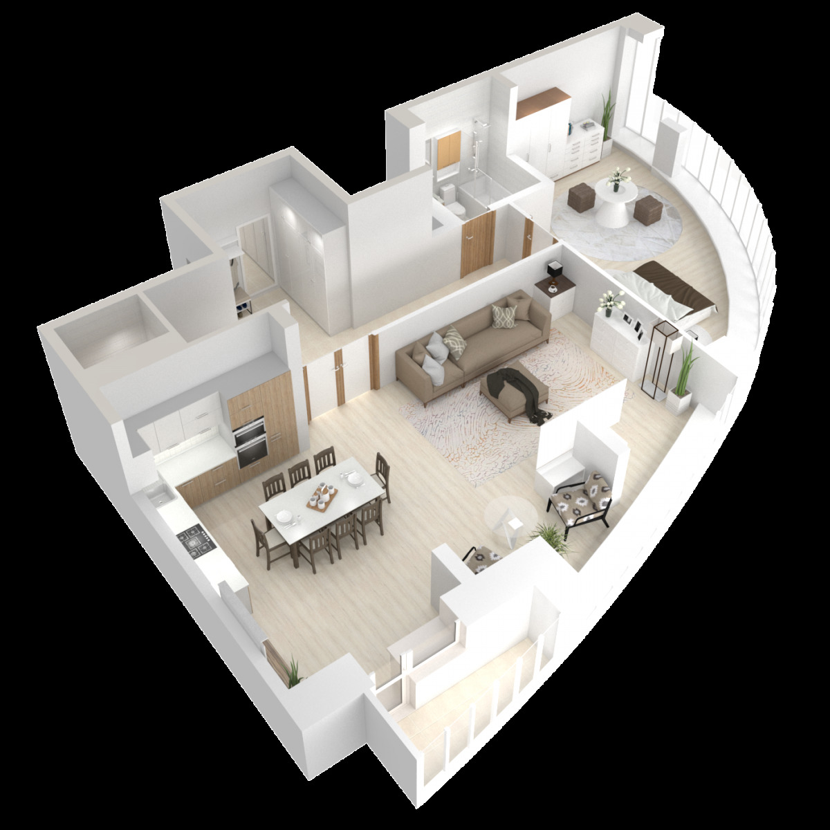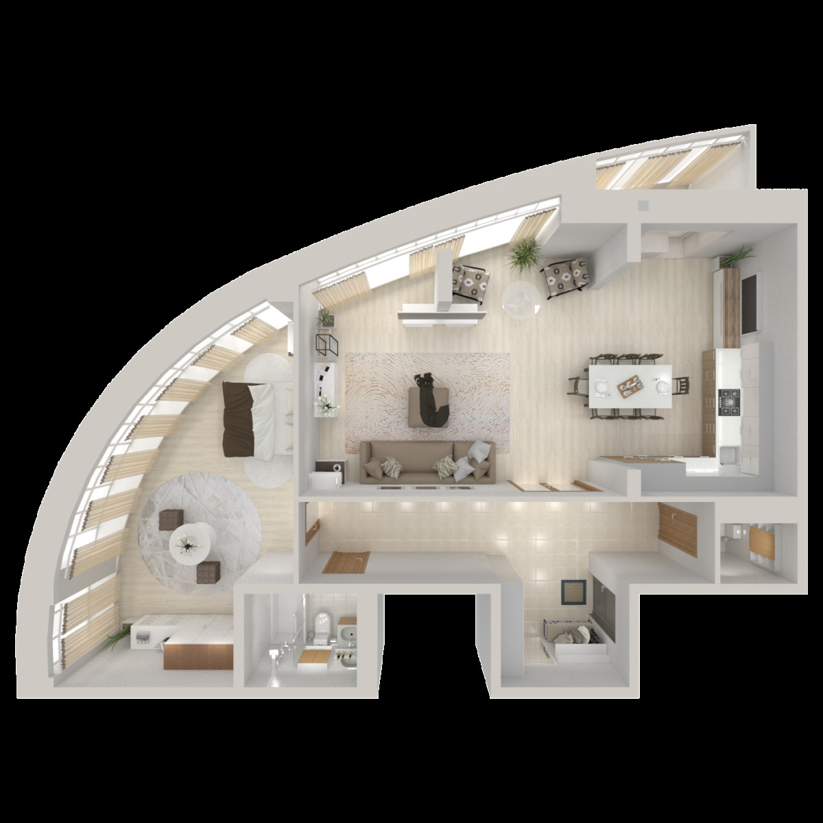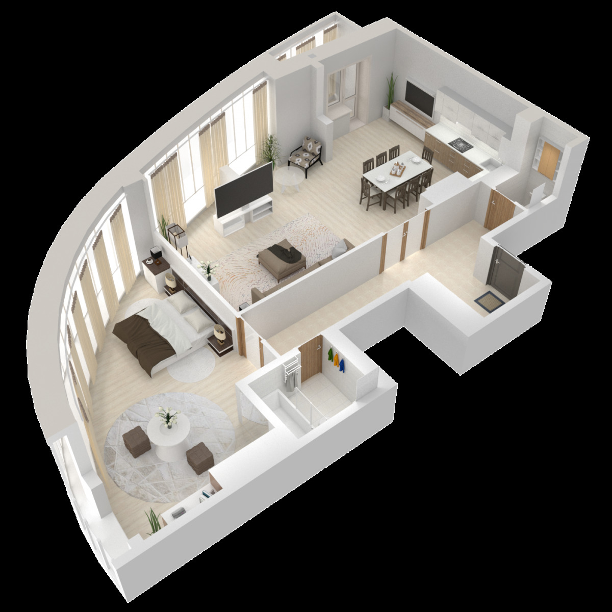 - L'appartement de deux pièces de rayon d'angle contient un arrangement confortable des pièces et un couloir qui fournit des entrées séparées à toutes les pièces.