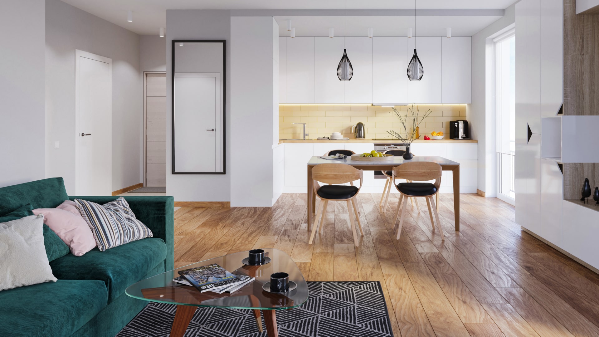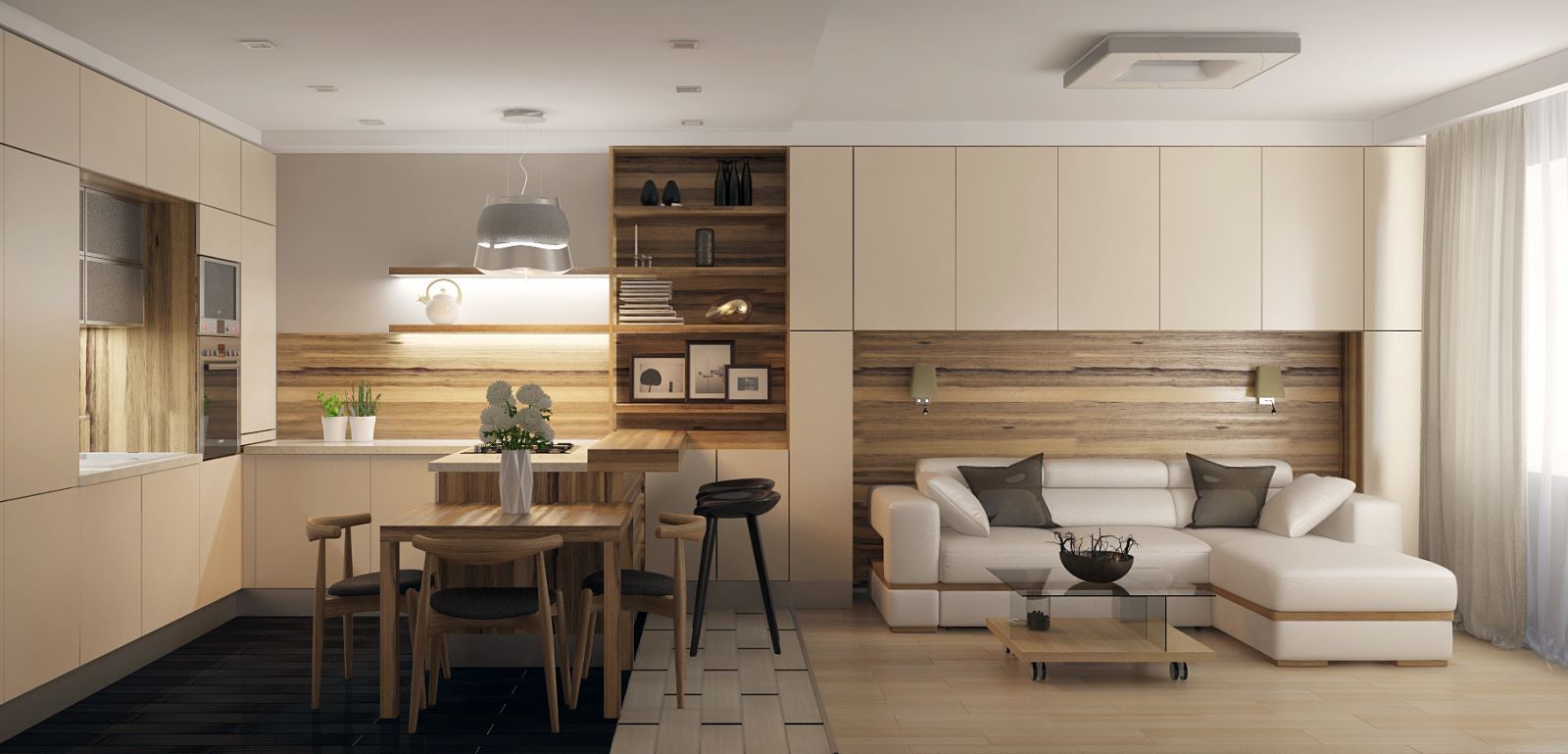 Avec des meubles... Vous pouvez séparer la cuisine du salon avec un comptoir de bar, et la salle à manger de la zone de loisirs avec une étagère lumineuse double face avec étagères ouvertes.