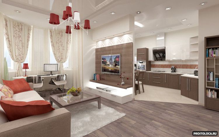 Une grande salle permet de réunir une famille non seulement à table... Compte tenu de la présence de zones, il y a de la place pour toute personne vivant en appartement. L'un prépare à manger, le second regarde la télévision, le troisième se repose sur le canapé avec un livre. Si vous êtes fatigué de la communication, il y a toujours la possibilité de vous retirer dans une pièce séparée.
