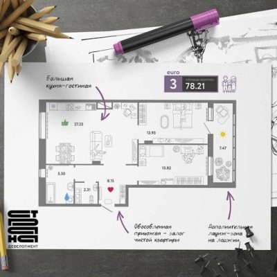 La disposition de l'appartement euro diffère des appartements habituels par la présence d'une grande pièce qui combine les fonctions d'une cuisine, d'une salle à manger et d'un salon. Les chambres, la salle de bains et le couloir sont situés séparément. La pièce principale est un studio, complété par une, deux ou trois chambres avec entrées indépendantes.