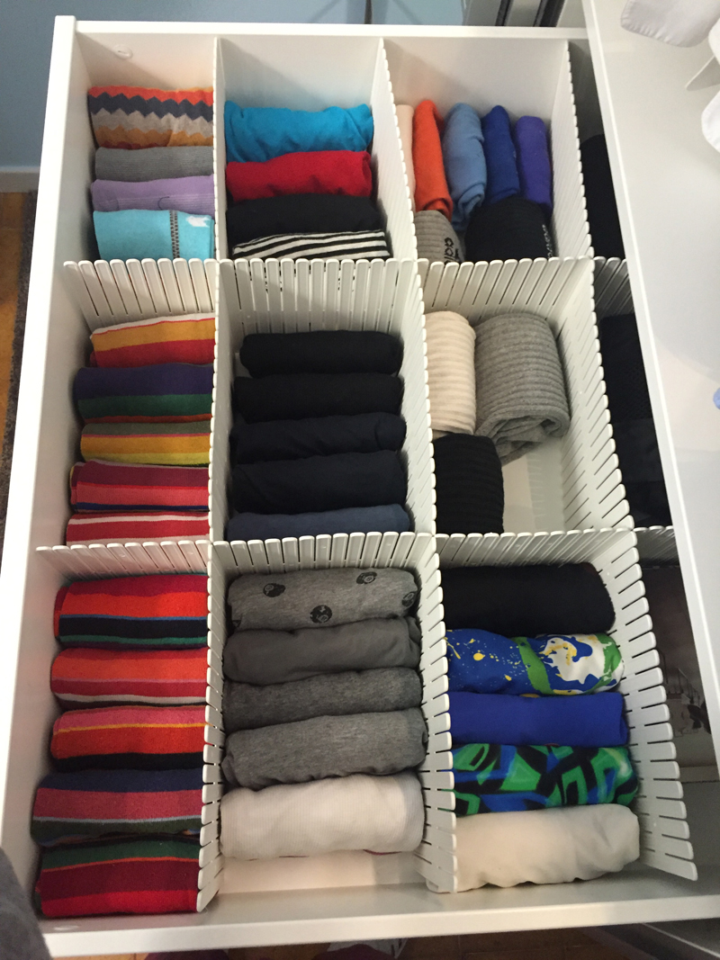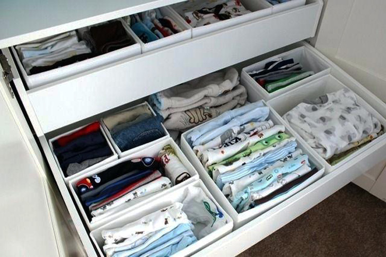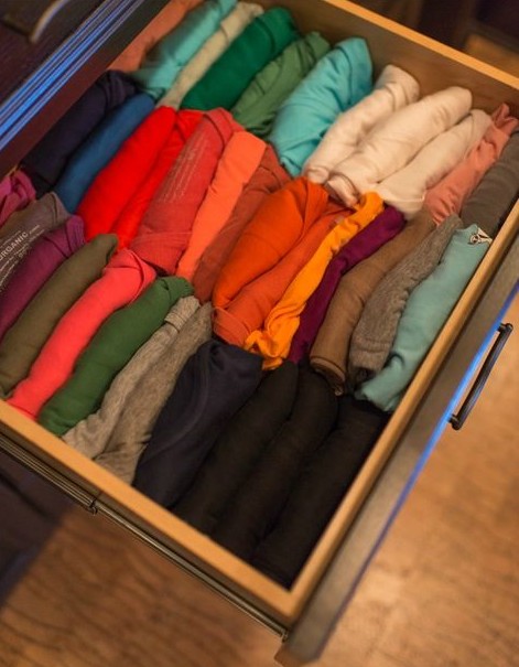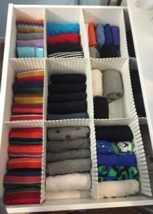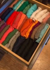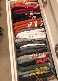 Dans un tiroir d'une commode ou d'une armoire, lorsqu'il est placé horizontalement, il est préférable de disposer les vêtements par étapes afin de pouvoir immédiatement voir et retirer celui que vous souhaitez. Les tiroirs sont parfaits pour le stockage vertical ou pour installer des organisateurs spéciaux, ainsi que des paniers bas.