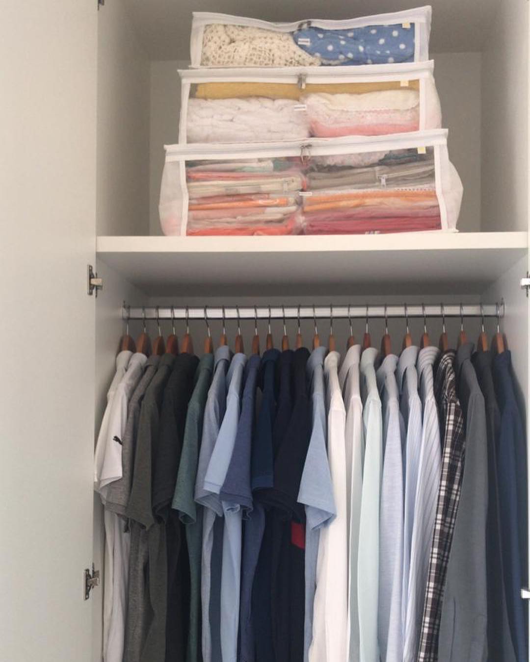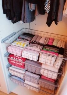 De plus, s'il y a beaucoup de t-shirts, ou peut-être que les effets personnels de toute la famille sont rangés au même endroit, ils peuvent être combinés en piles ou en compartiments par couleur, style et taille. Les vêtements qui sont démontés pour la saison sont très faciles à échanger - il suffit de reculer les vêtements chauds et les légers vers l'avant, ou vice versa. Toutes ces actions vous permettent d'organiser les choses de manière compacte et magnifique, puis de maintenir facilement l'ordre entre elles.
