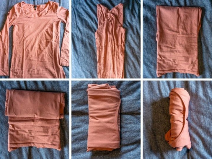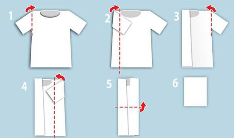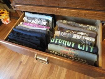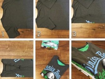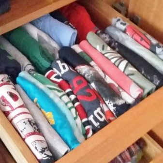 En plus de placer les vêtements, ils doivent également être pliés correctement - afin que la chose ne soit pas très froissée après dépliage et ne s'étire pas. Les t-shirts avec des imprimés méritent une attention particulière, car c'est cette partie d'entre eux qui est la plus capricieuse. Si le motif est appliqué sur le tissu, il peut se fissurer aux endroits des plis ou des plis.