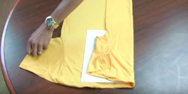 Disposez le T-shirt sur le tableau déplié (modèle). Les manches et autres pièces qui dépassent les limites doivent être enveloppées de manière à obtenir une sorte de rectangle. Ensuite, nous plions les côtés un par un, et à la fin - la partie inférieure. Cet appareil peut être fabriqué à la main et peut être utilisé pour plier des chemises, des pulls et même des jeans.