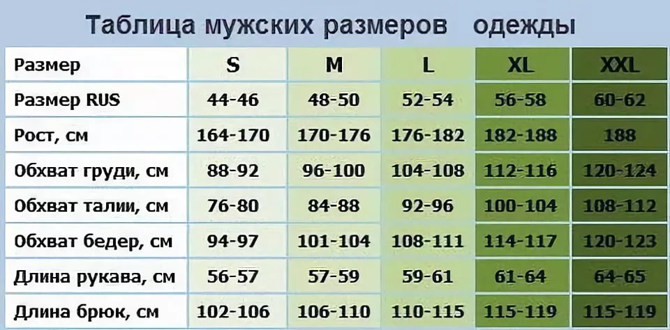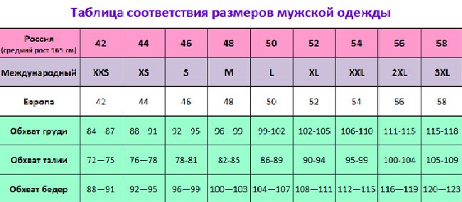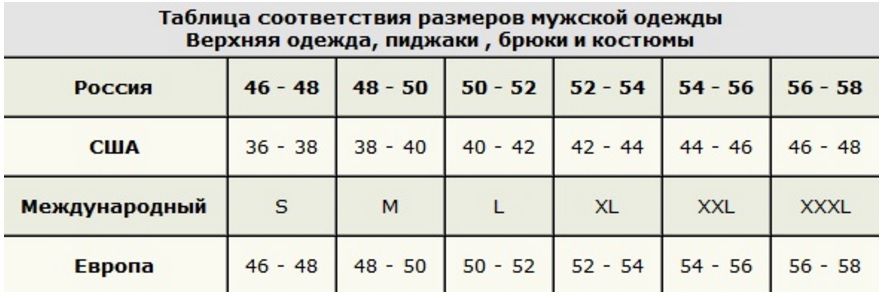 Bien sûr, souvent sur les sites de vêtements pour hommes il y a aussi un décodage des tailles... À côté des désignations de lettres ou de chiffres, vous pouvez trouver une colonne par taille, ainsi que le tour de taille ou de poitrine en centimètres. Après avoir consulté une telle table, vous pouvez facilement choisir la taille requise pour vous-même.