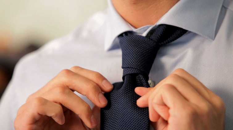 - La cravate doit être placée autour du cou de manière à ce que sa moitié la plus large soit légèrement plus basse que la rétrécie.
