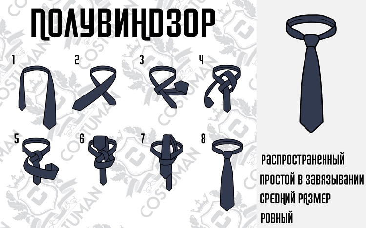 Cette option de nouage est plus difficile que toutes les précédentes. Cependant, si un homme peut serrer les quatre et le petit nœud, alors le demi-windsor sortira sans aucun problème.
