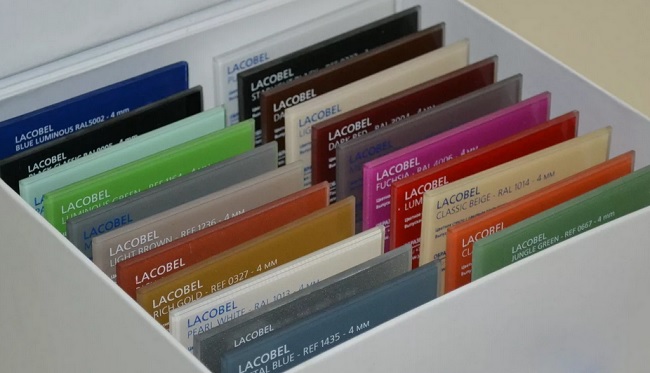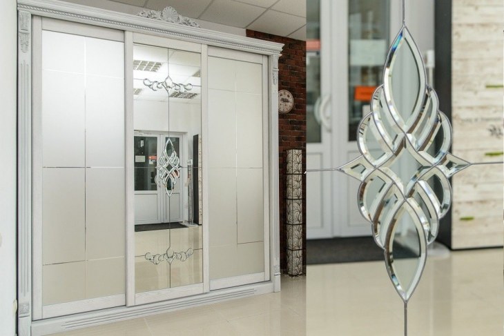 Pour donner aux meubles un aspect intéressant, des verres transparents, mats, colorés et teintés peuvent être utilisés. Un ornement, un motif, une texture ou une imitation de mosaïque peut être appliqué sur une telle surface.