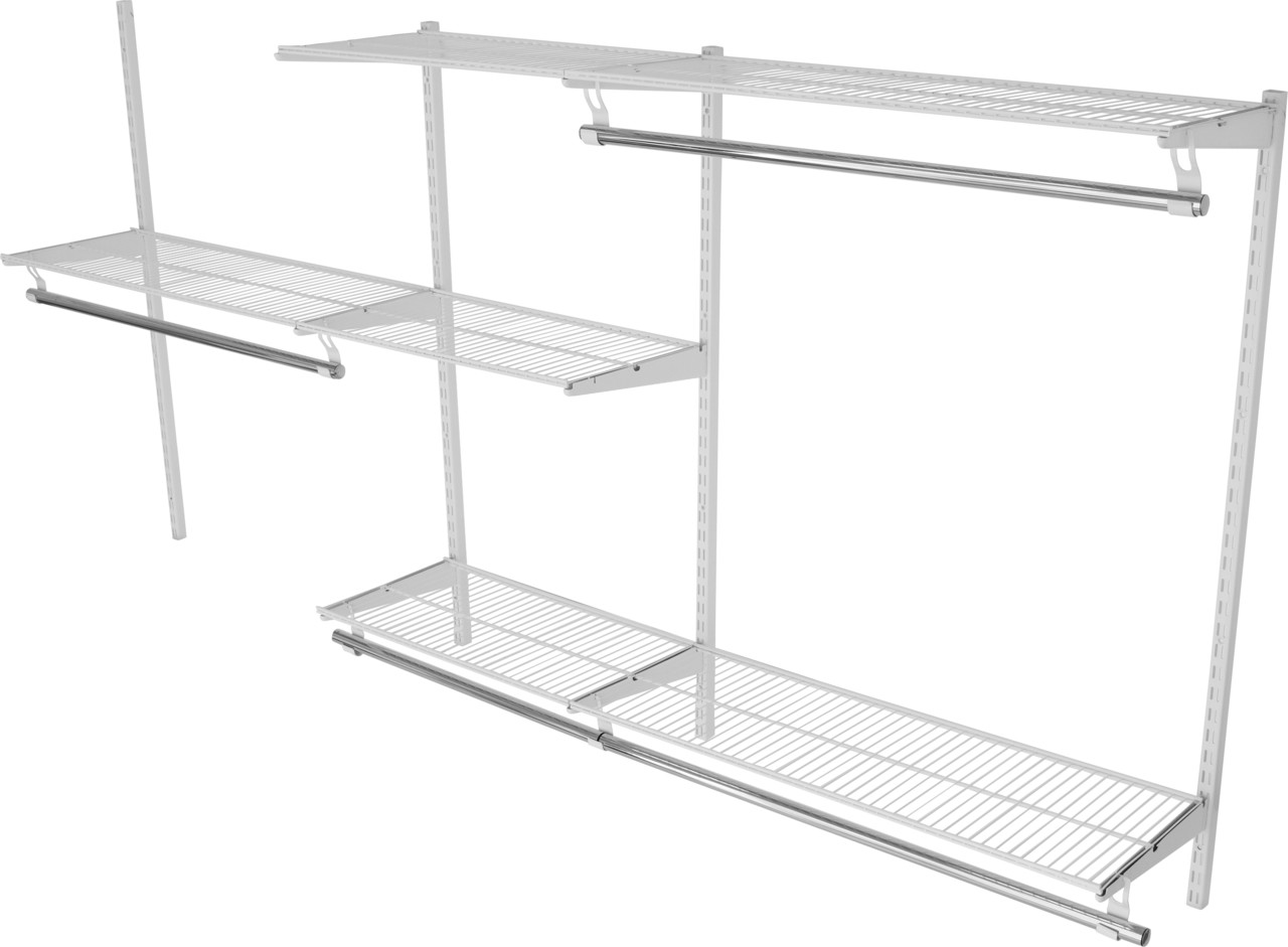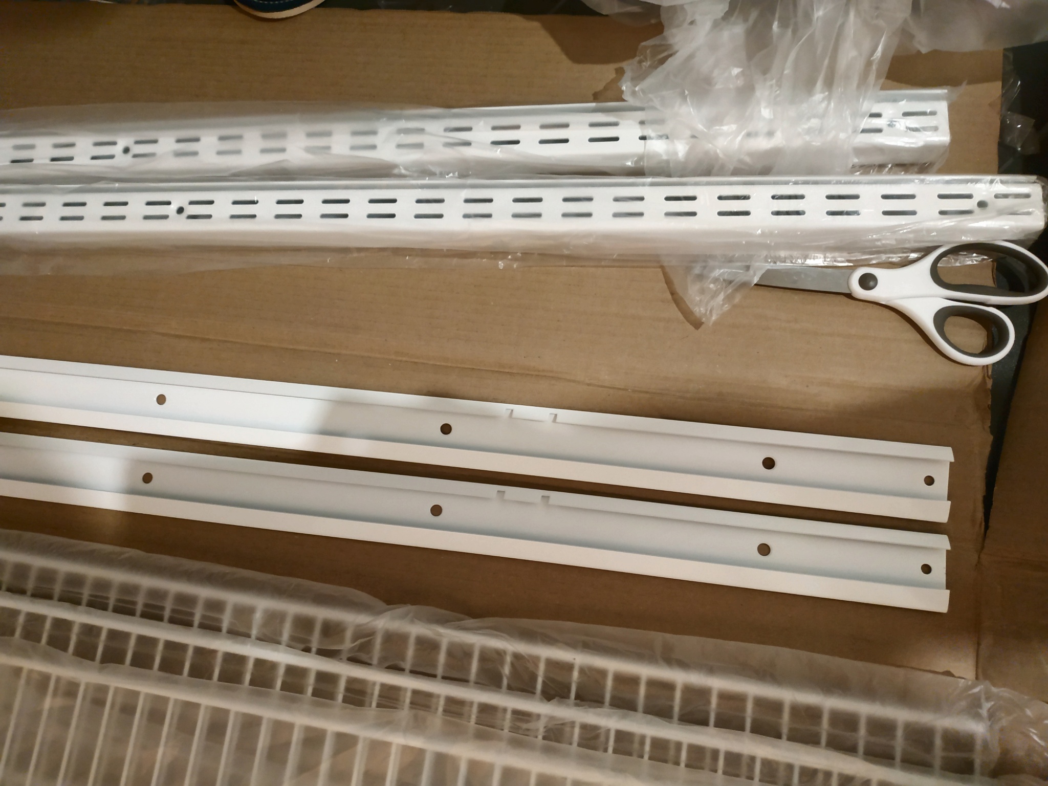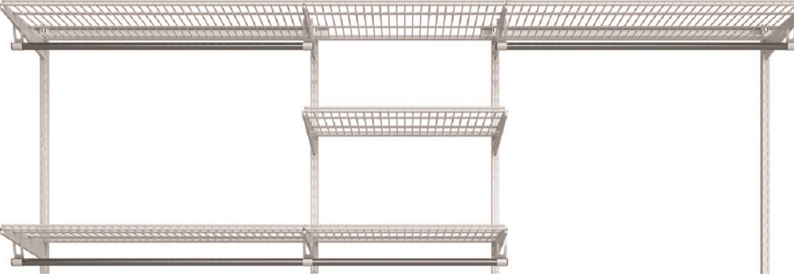 Ensemble complet : supports de rails, étagères grillagées, barre de suspension, attaches.