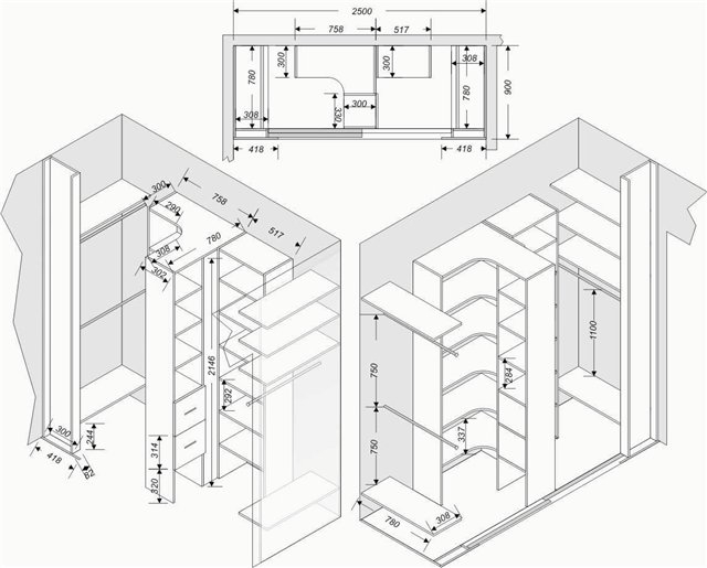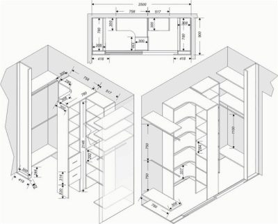 - La largeur recommandée des étagères intérieures est de 40 cm, tandis que pour les mezzanines et les compartiments avec cintres, elle devrait être deux fois plus grande.