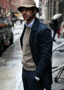 - Fédor Sera bien dans un style décontracté avec une chemise sans col et une veste à boutonnage simple en tissu épais. Fedora est le plus approprié dans une image d'entreprise. Les options modernes avec une veste à boutonnage simple avec un col à revers en soie seront les plus pertinentes.