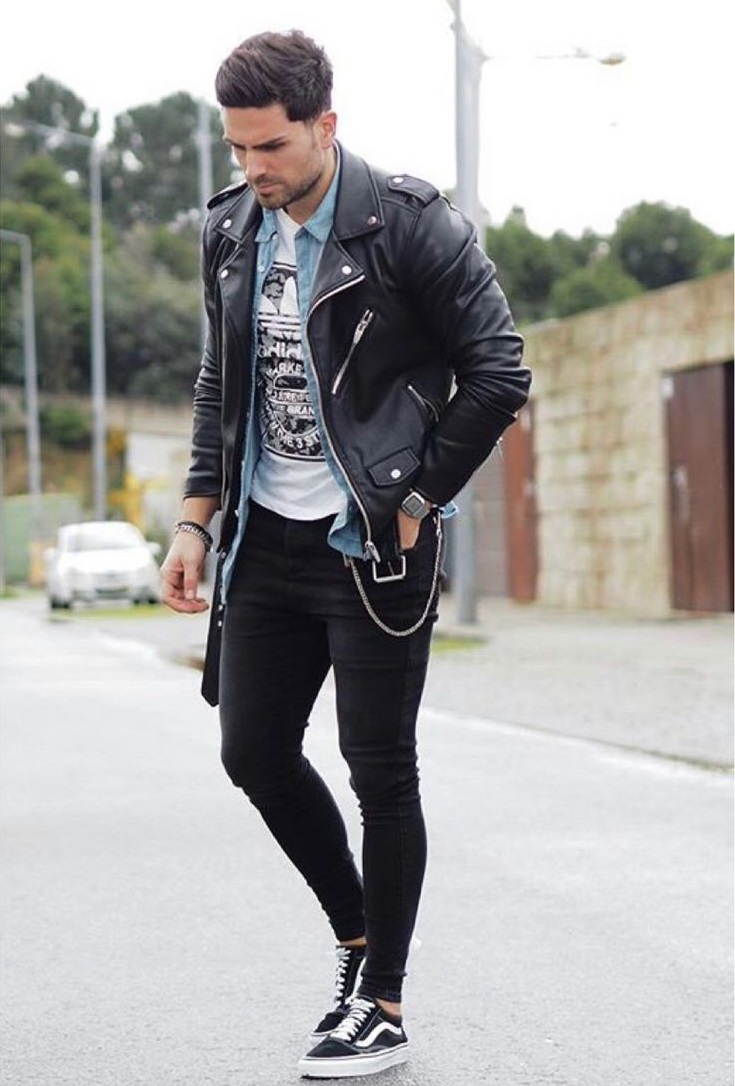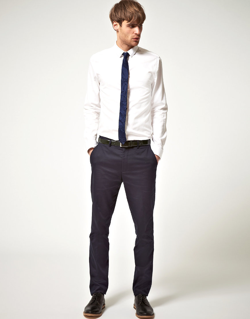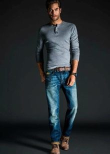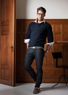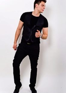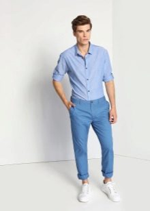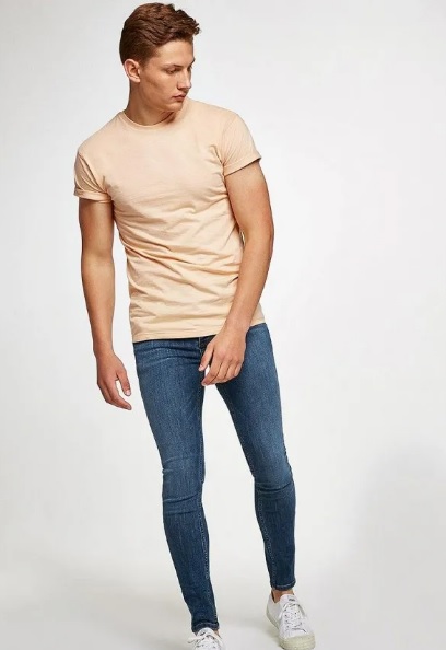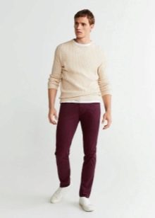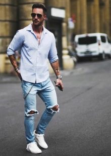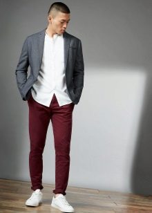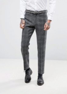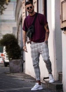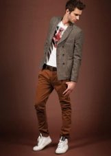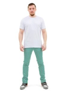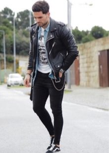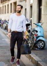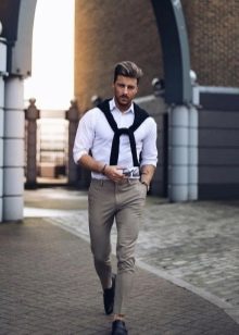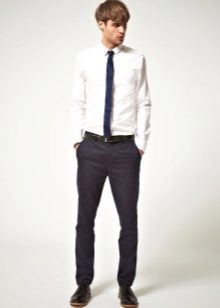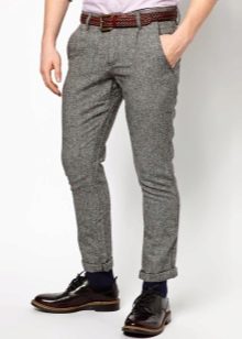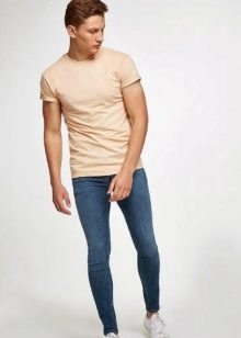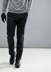 I giovani spesso scelgono pantaloni skinny. In loro, gli uomini non solo trasformano la loro immagine, ma enfatizzano anche la bellezza della propria figura. Queste opzioni si indossano al meglio con top voluminosi, come maglioni, camicie e magliette larghe. Mocassini, scarpe brogue o mocassini sono più adatti per pantaloni skinny, la scelta dipende dalla comodità di indossarli.