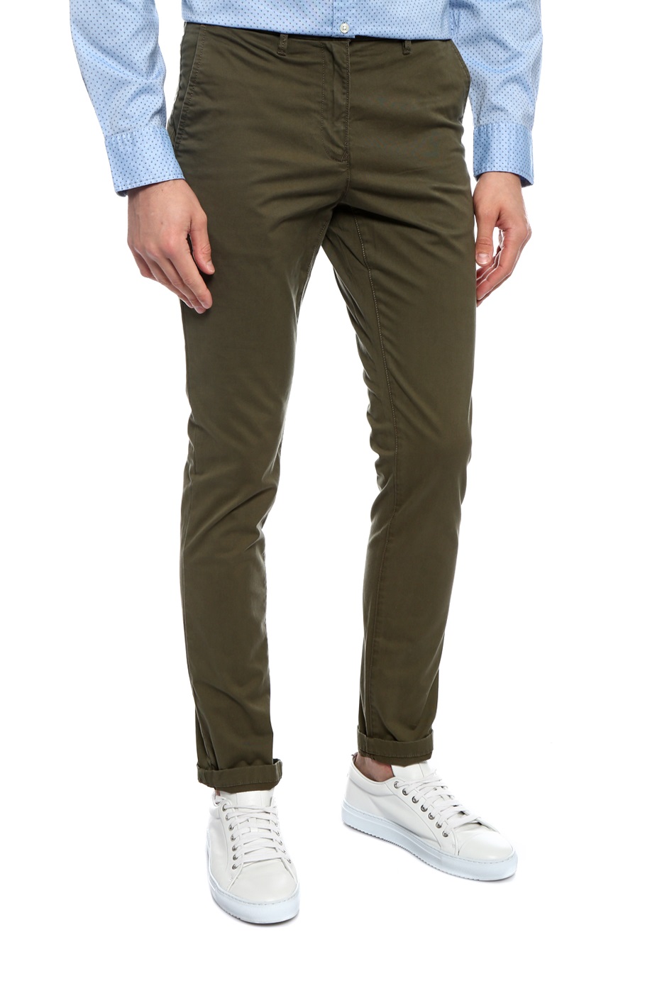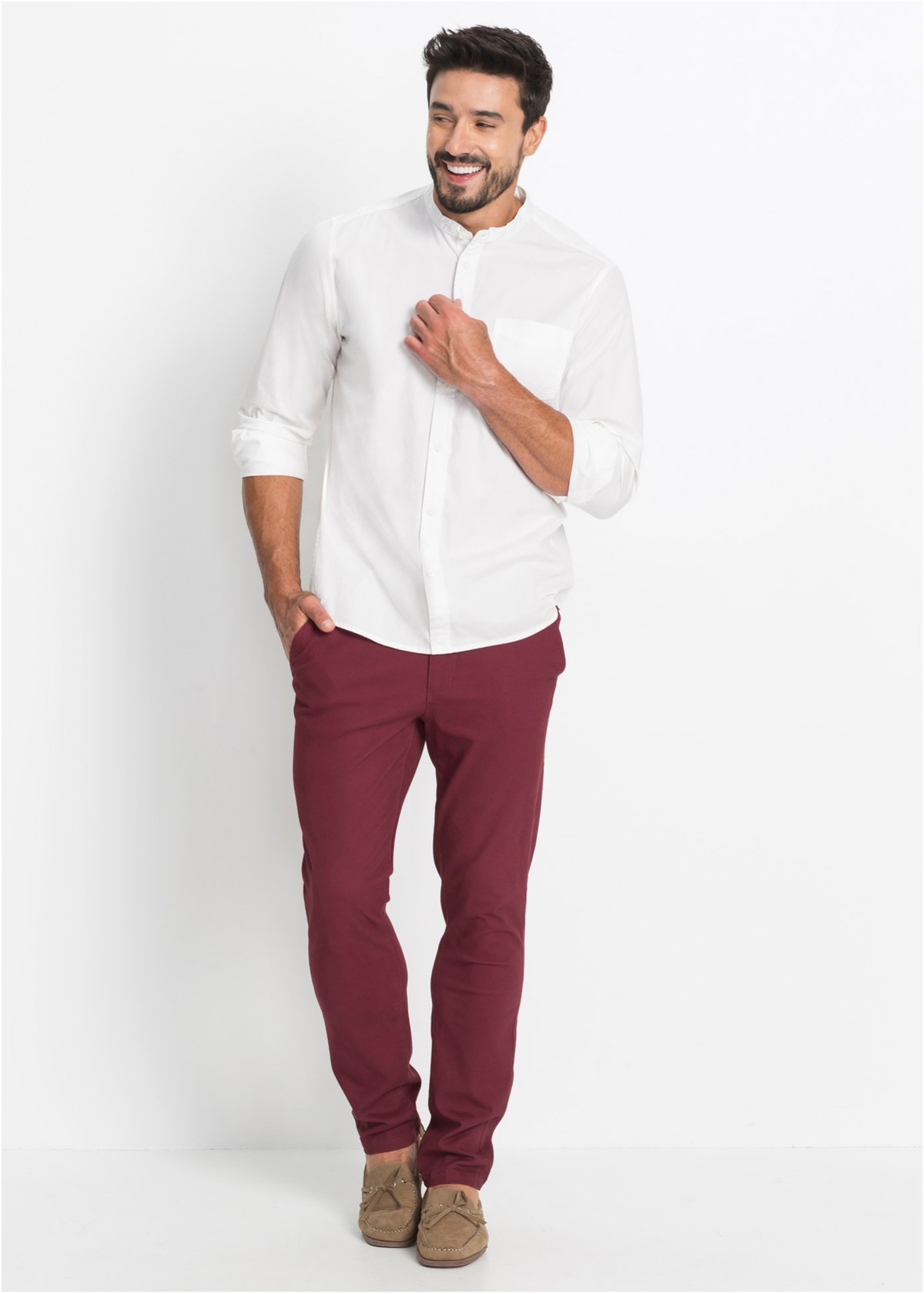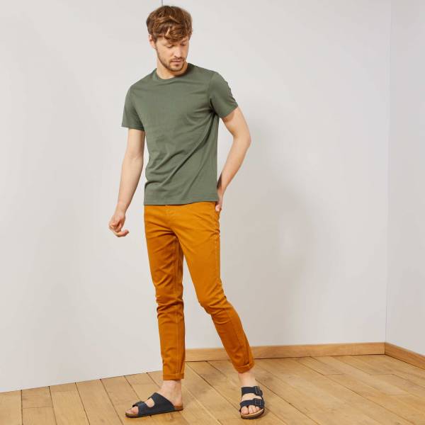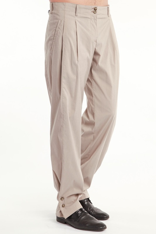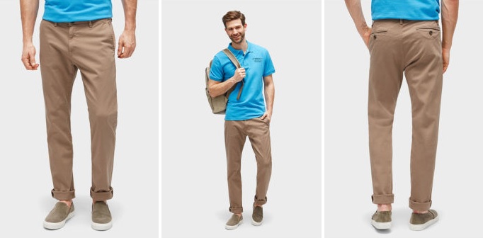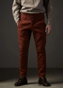 Un tipo di pantaloni poco conosciuto, ma sono abbastanza comuni negli abiti dei ragazzi moderni. Nella parte superiore del pantalone sono presenti delle piccole pinces, sui lati ci sono tasche interne, sul retro ci sono tasche con chiusure. Su una gruccia, i pantaloni chino possono sembrare ridicoli, ma su un uomo mostreranno le loro qualità il più possibile.